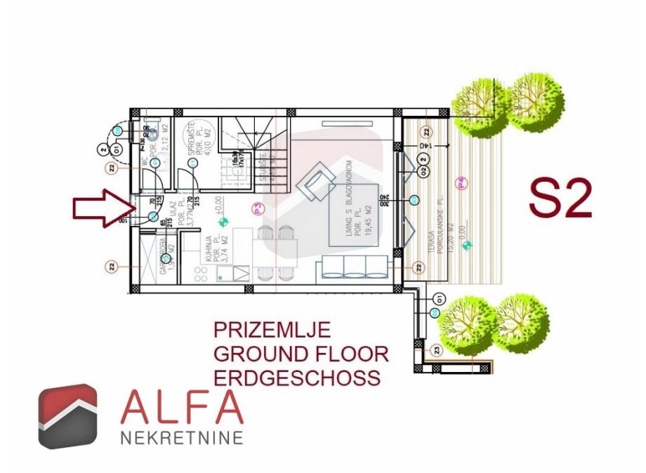 - U prizemlju je ulazni hodnik, garderoba, zaseban toalet, spremište, kuhinja sa blagovaonicom i dnevnim boravkom iz kojeg se ide na terasu i dvorište ispred stana.