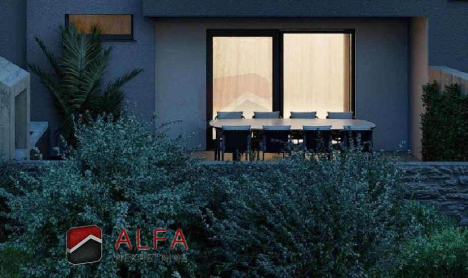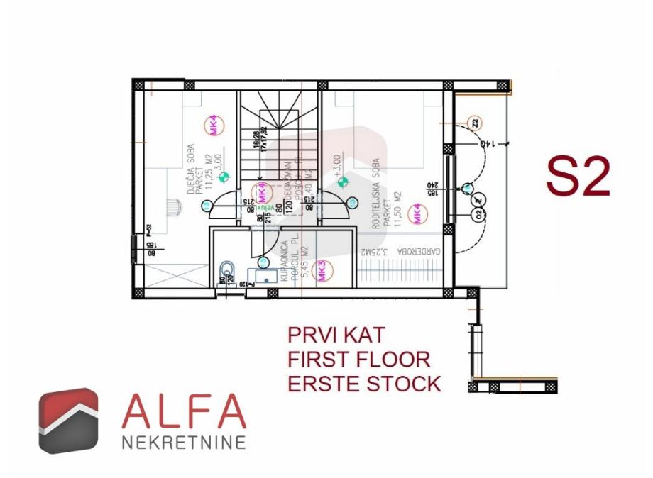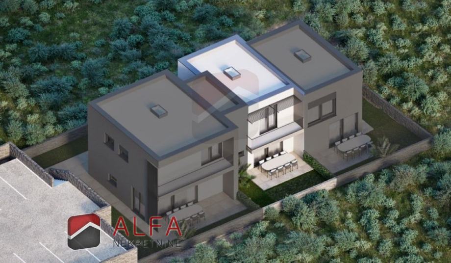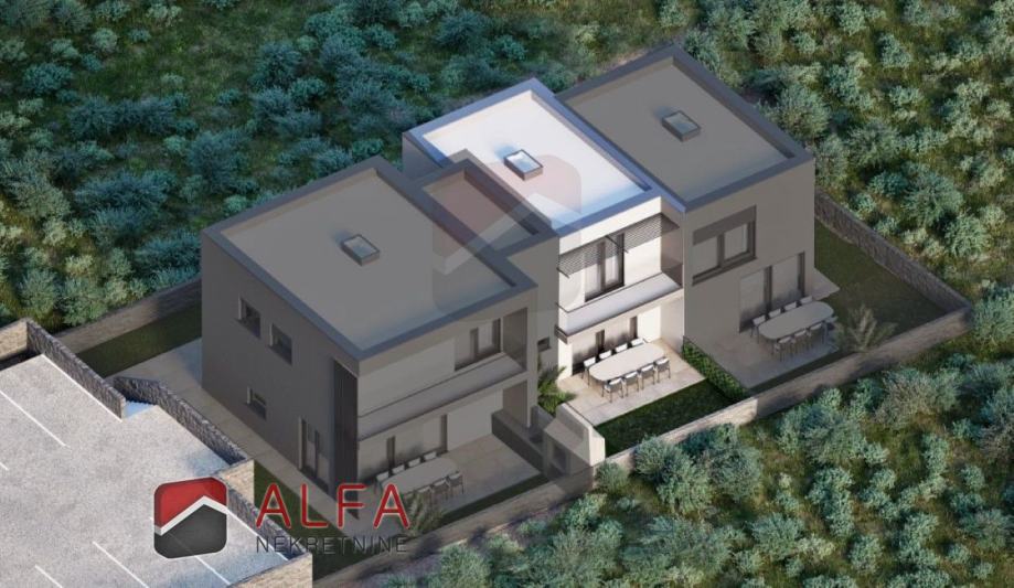 Kuća se prostire kroz dvije etaže, ima svoje dvorište i bit će etažirana kao stan S2. Površina unutarnjeg prostora na obje etaže je 80 m2 + natkriveni balkon 7,5 m2 + terasa prizemlje 15 m2 + dvorište 20 m2 + dva parkirna mjesta ukupno 30 m2.