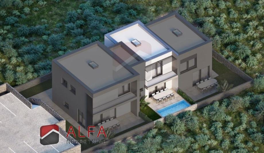 Vodice, novogradnja, prodaje se kuća u sredini niza od tri spojene kuće. Ova kuća moderne arhitekture je udaljena od mora 1200 metara.