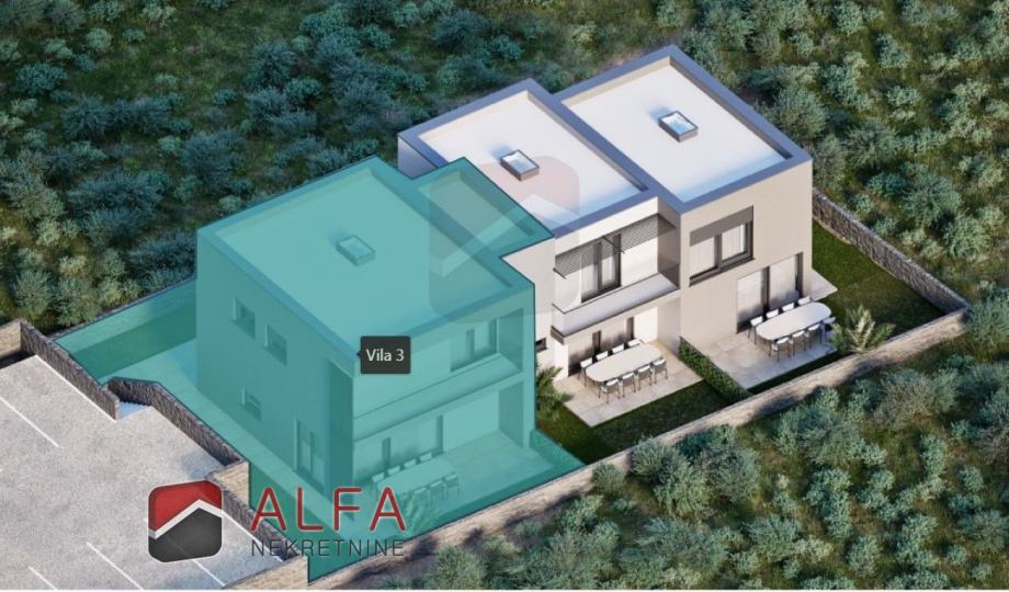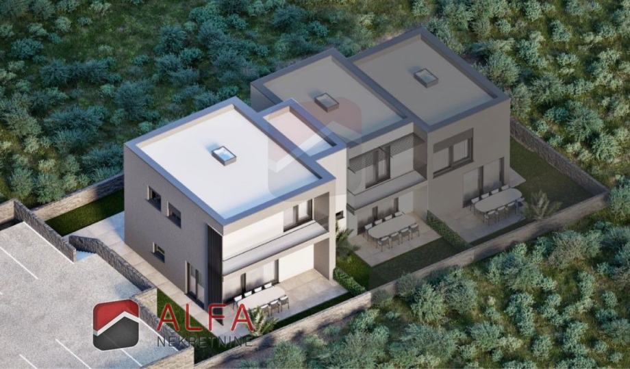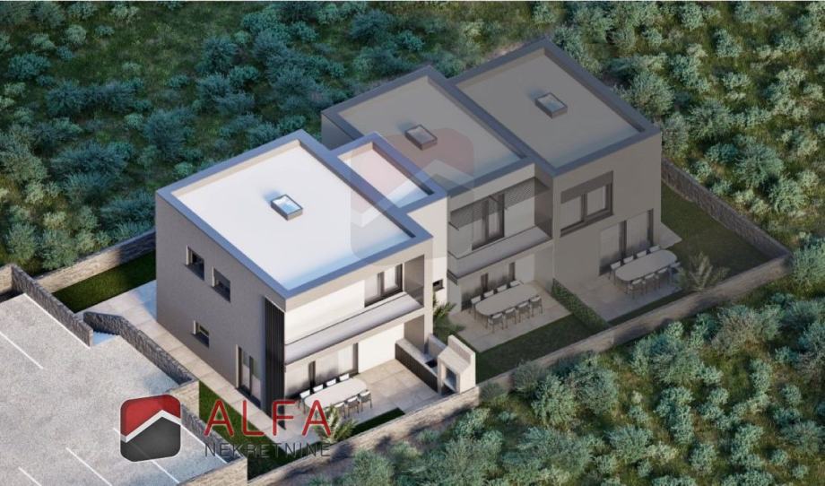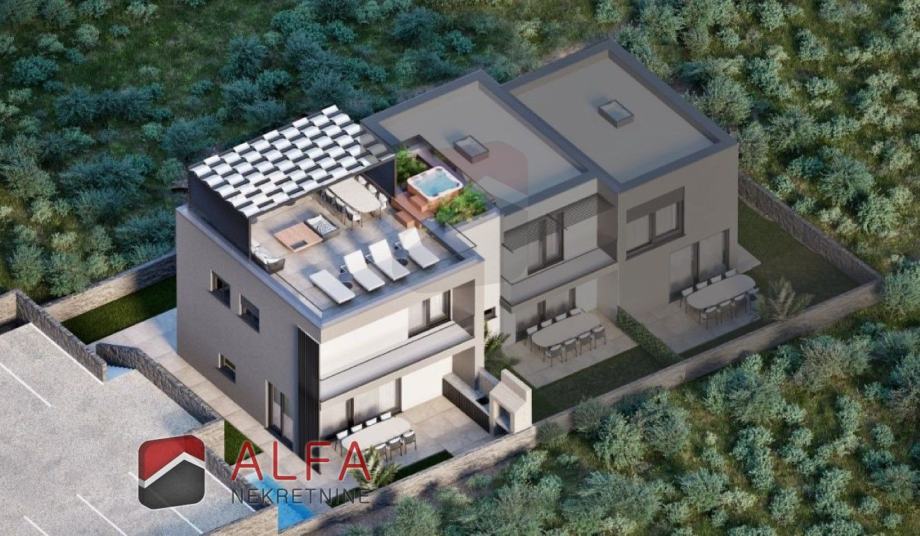 Vodice, novogradnja, prodaje se krajnja kuća u nizu od tri moderno projektirane kuće. Udaljena je od mora 1200 metara.