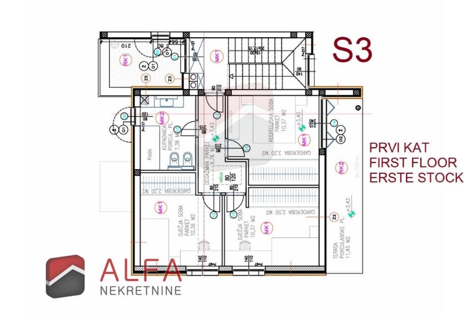Kuća se prostire kroz dvije etaže, ima svoje dvorište i bit će etažirana kao stan S3. Površina unutarnjeg prostora na obje etaže je 140 m2 + terasa u prizemlju 28,50 m2 + balkon na katu 11,5 m2 + dvorište 45 m2 + dva parkirna mjesta ukupno 30 m2.