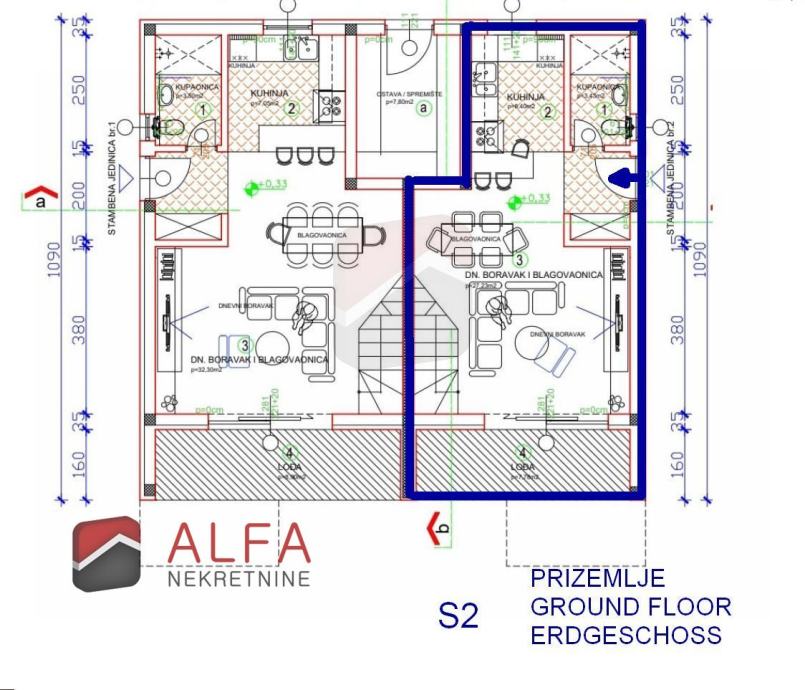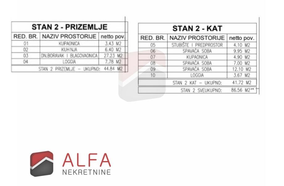 Kuća će biti etažirana kao dvoetažan stan S2, ukupne površine 86,56 m2 i imat će svoj dio dvorišta od oko 150 m2.