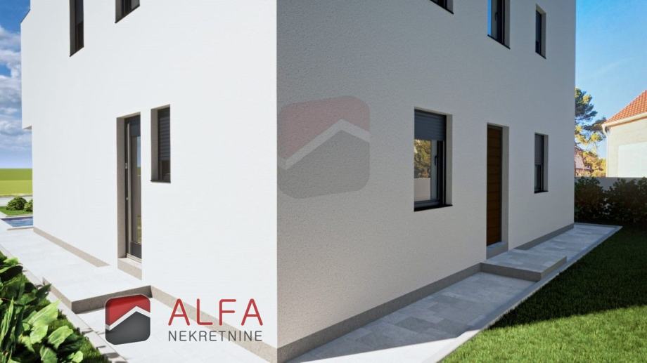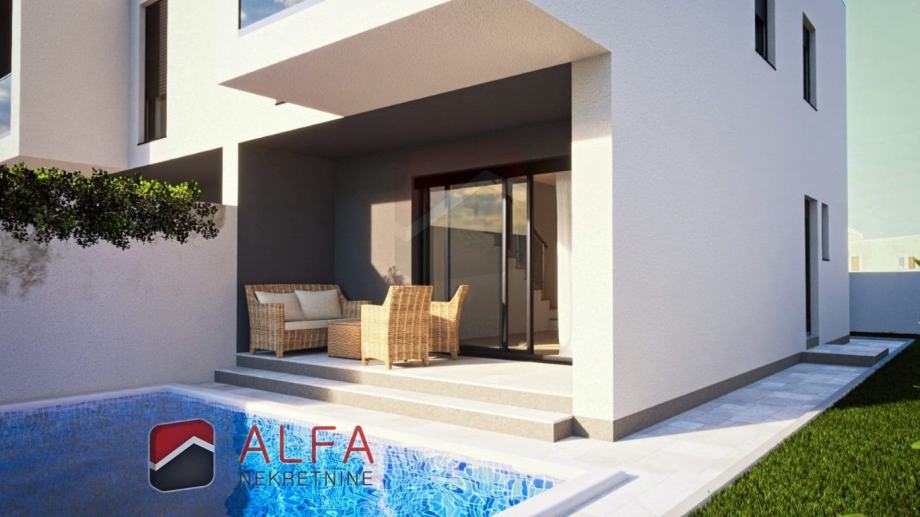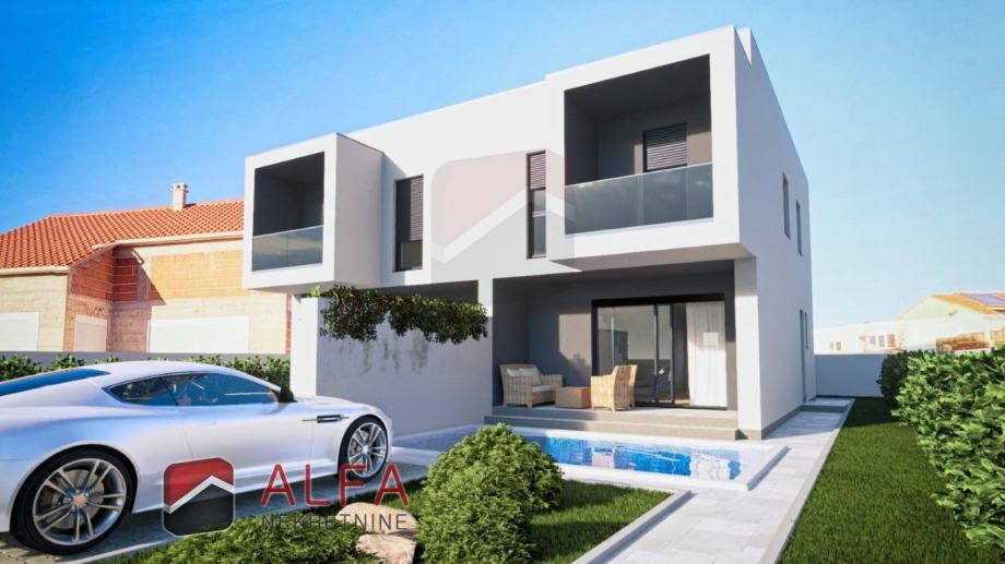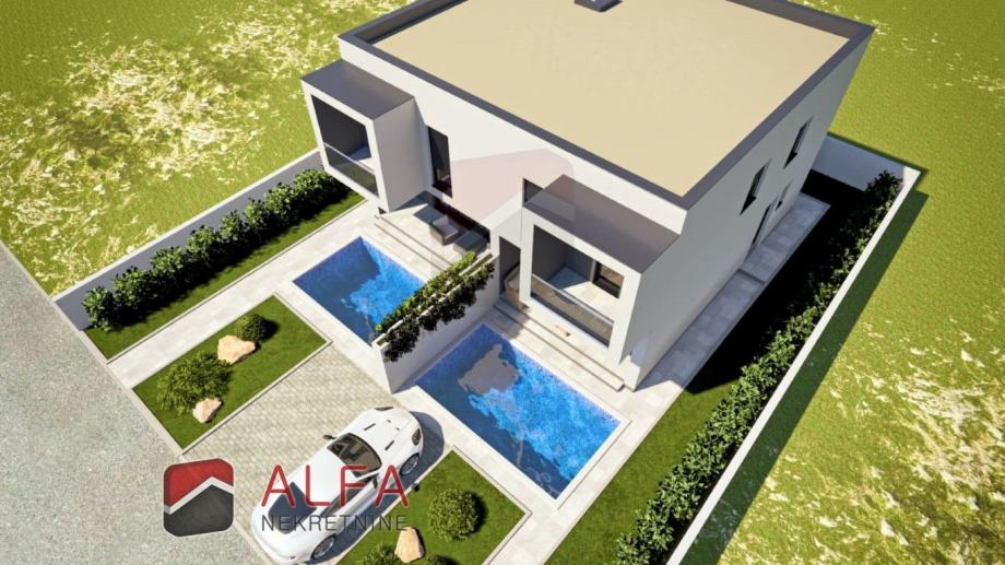 Vodice, prodaje se nova dvojna manja obiteljska kuća s bazenom. Kuća je moderne arhitekture i udaljena je od mora 1700 metara.