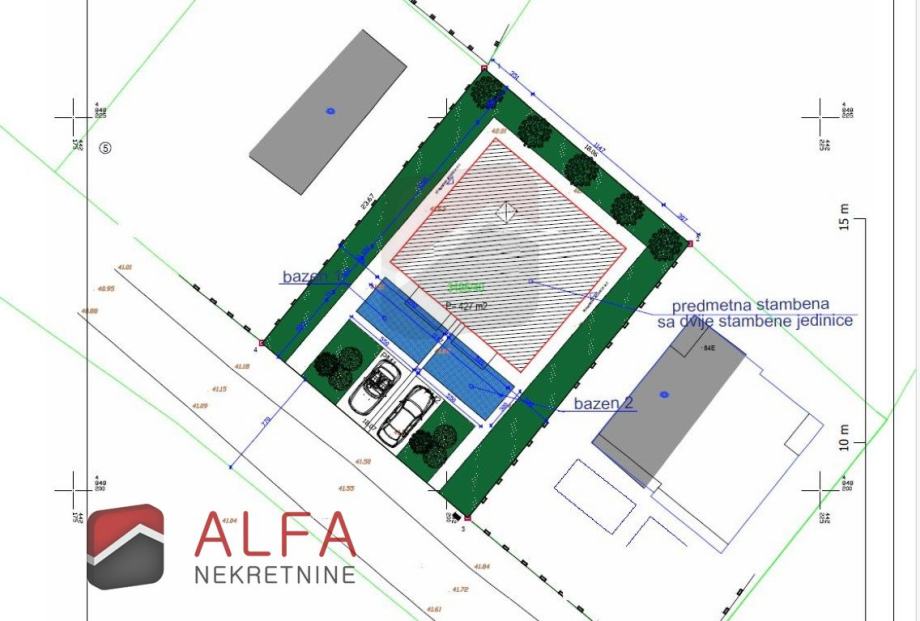 Ispred kuće u prednjem dijelu dvorišta je bazen veličine 15 m2. Dvorište je dijelom popločano a dijelom ostavljeno u zelenilu. U dvorištu ima prostora za parkiranje dva automobila.