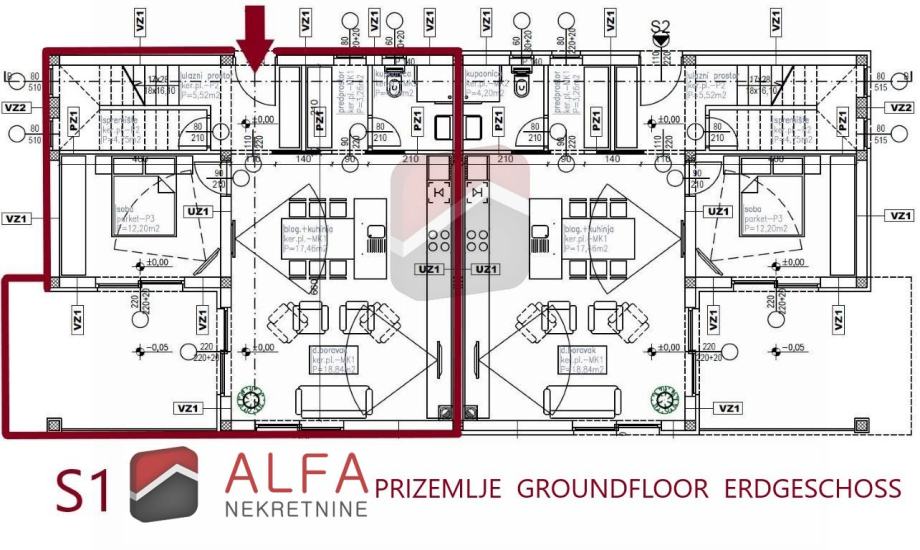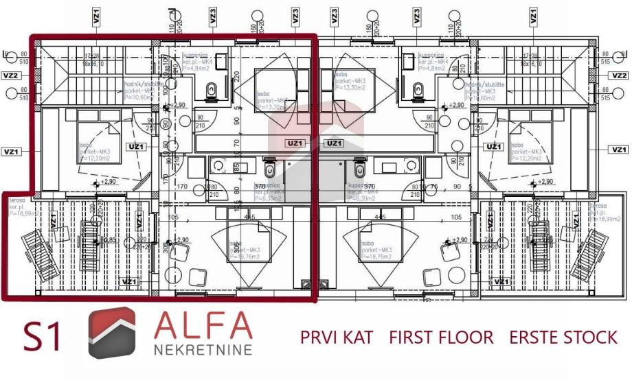 Kuća će biti etažirana kao dvoetažan stan S1. Ukupna podna površina na sve tri etaže je oko 238 m2 i imat će svoj dio dvorišta.
