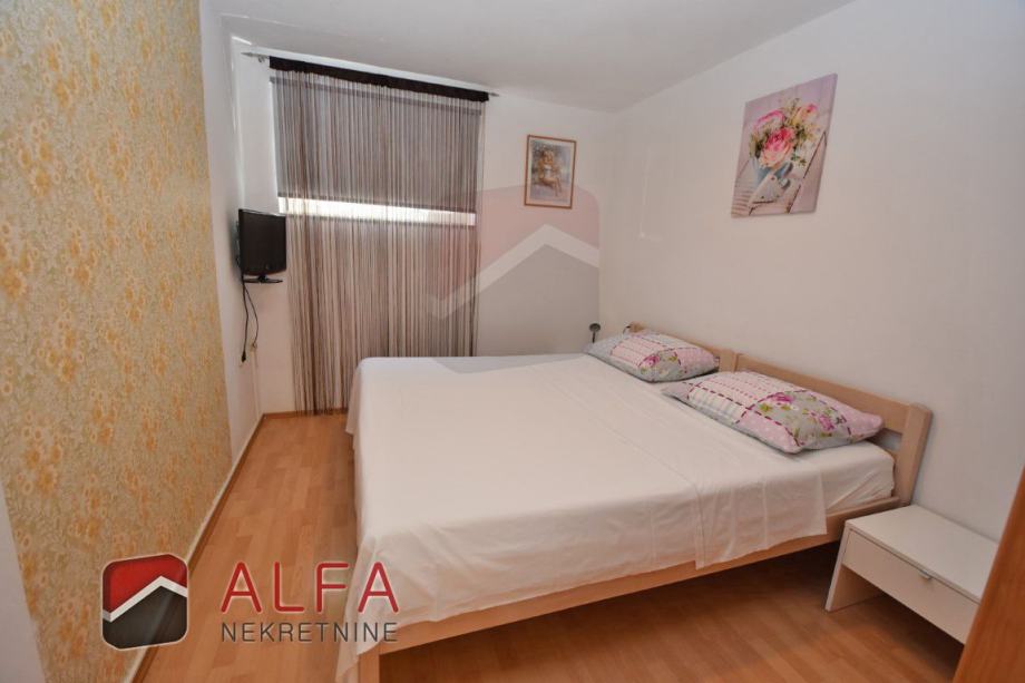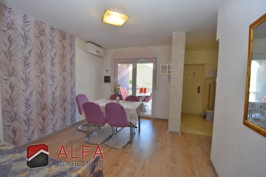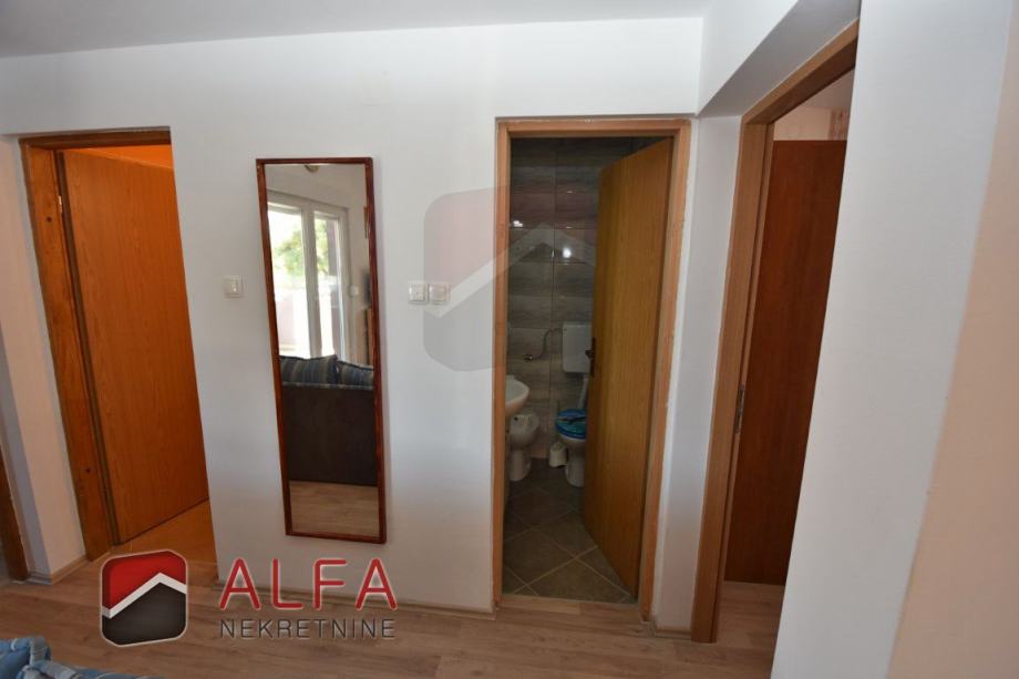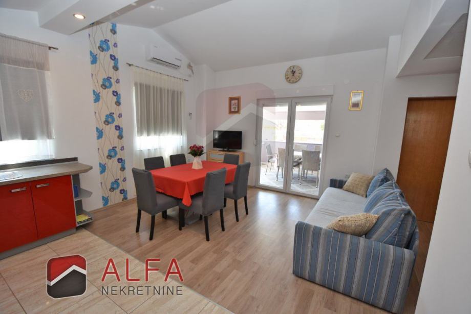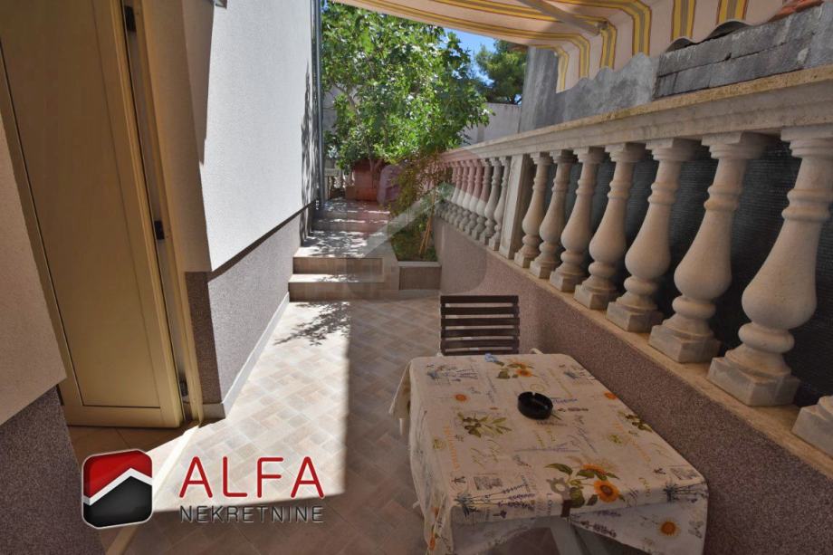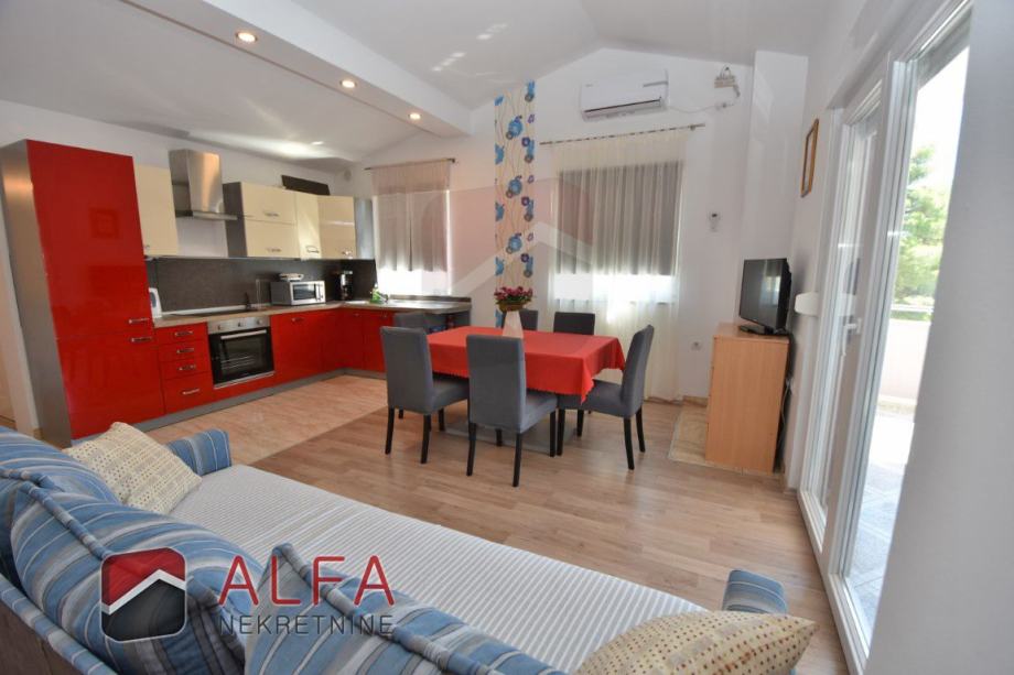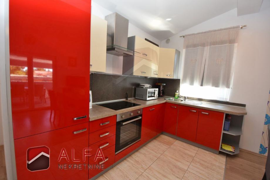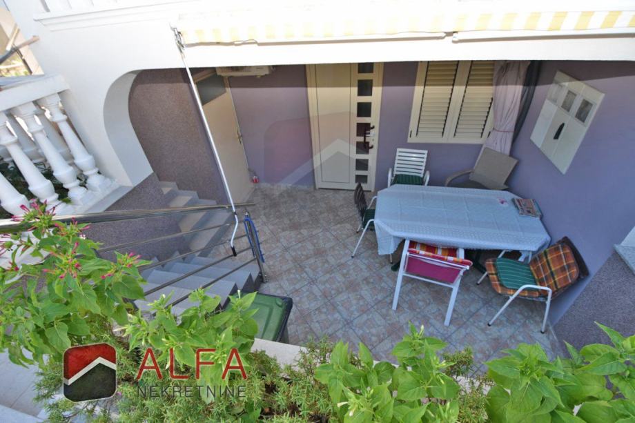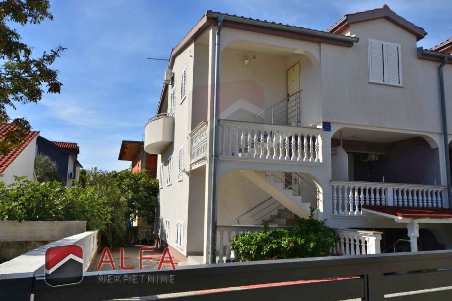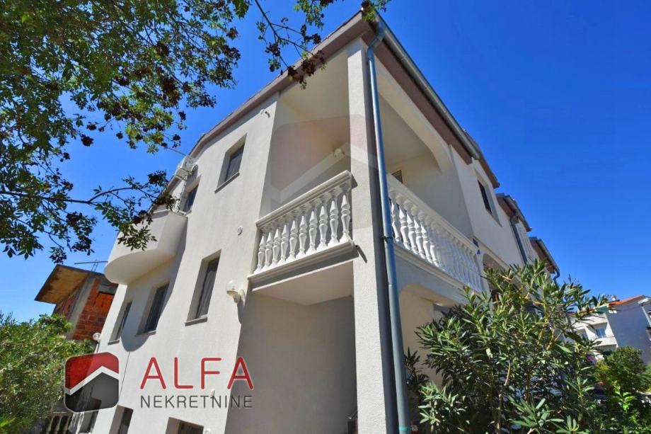 Vodice, prodaje se lijepa dvojna kuća s četiri apartmana, udaljena 750 m od mora. Ukupna bruto površina kuće je 218 m2 i nalazi se na zemljištu površine 197 m2. Sastoji se od suterena, visokog prizemlja i prvog kata.