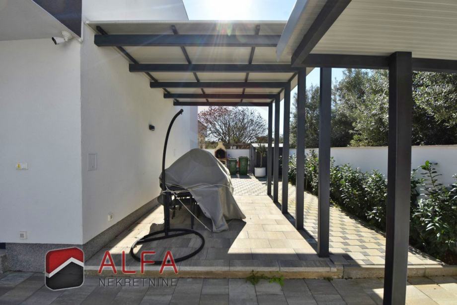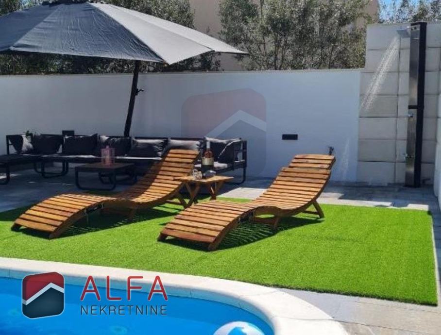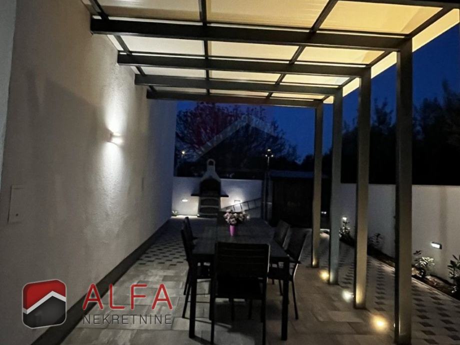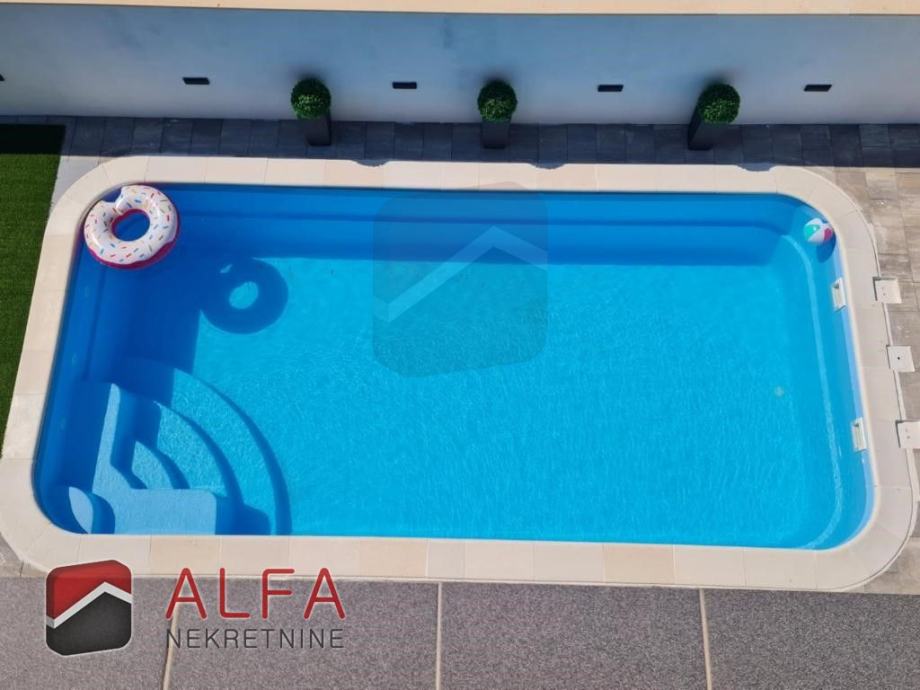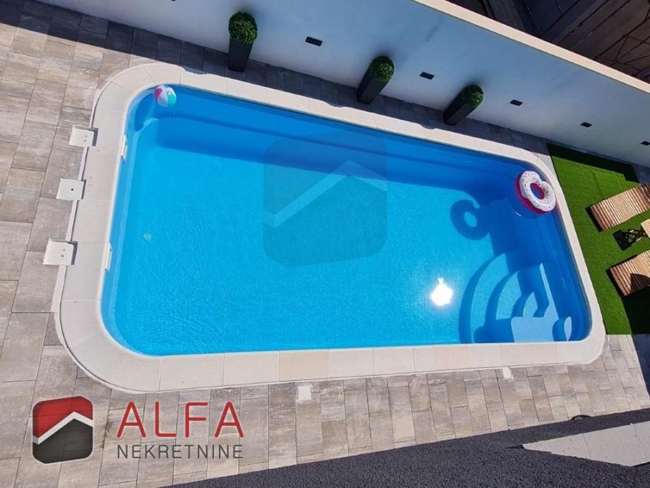S vanjske strane kuće u dvorištu je vrtna alatna kućica te roštilj. Bazen je površine 8m x 3m pored kojeg je i vanjski tuš te prostor za ljetno druženje u hladovini.