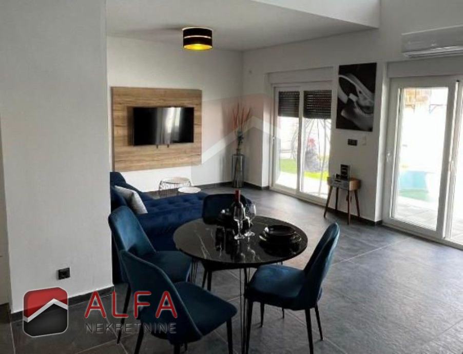 U donjoj etaži kuće je jedna spavaća soba, hodnik, zaseban toalet, dnevni boravak s kuhinjom i blagovaonicom te izlazom na lijepu prostranu terasu i dvorište gdje je bazen veličine 24 m2. Unutarnjim stepenicama se dolazi do prvog kata gdje su dvije spavaće sobe, svaka sa svojom kupaonicom i balkonom. Također unutarnjim stepenicama se dolazi do prostrane krovne nenatkrivene terase sa koje se pruža lijepi pogled na grad i more.