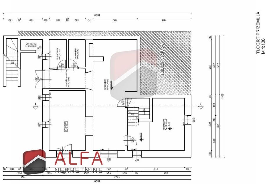 Prizemlje kuće je potpuno odvojeno. Ulaz može biti sa dvorišne i sa vanjske ulične strane. Cijelo prizemlje je neuređeno i ostavljeno novom vlasniku da ga uredi po želji. Trenutno je tu nekoliko prostranih spojenih praznih prostorija, te kupaonica. Taj prostor se može preurediti u odvojen stan, ured, skladište, garažu, možda kafić ili poslovni prostor raznih namjena, jer je lokacija odlična.
