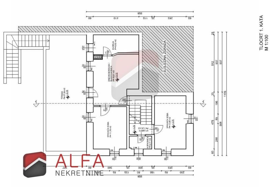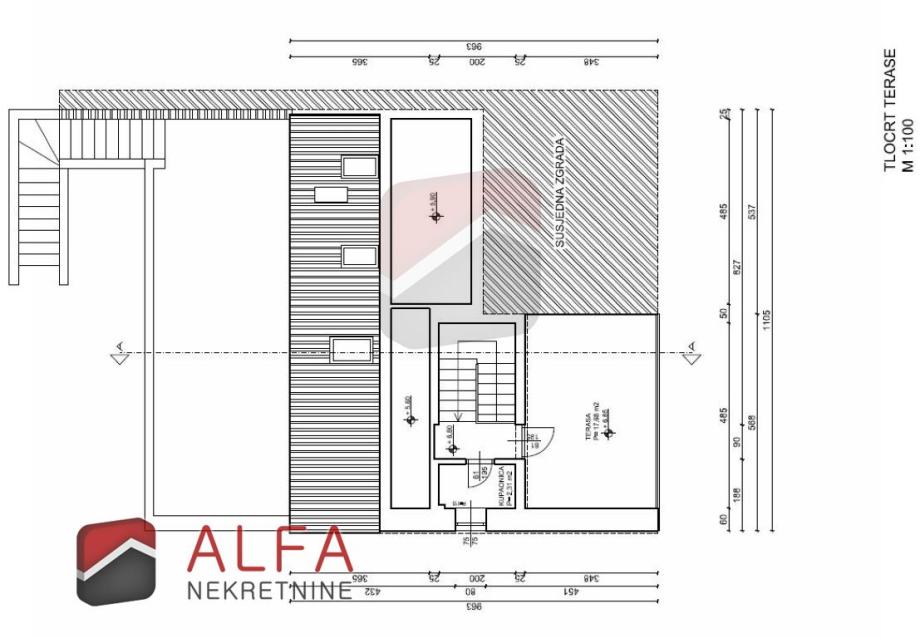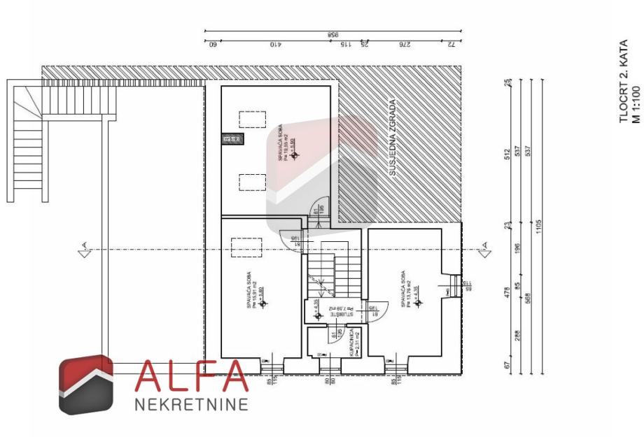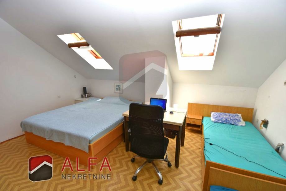 Ukupna površina kuće je 330 m2 i nalazi se na zemljištu od 278 m2. Ova prostrana kuća nema apartmane, nego je koncipirana na način da ima međukatove, a kroz sredinu kuće je stepenište. Sveukupno kuća ima 5 spavaćih soba i 4 kupaonice.