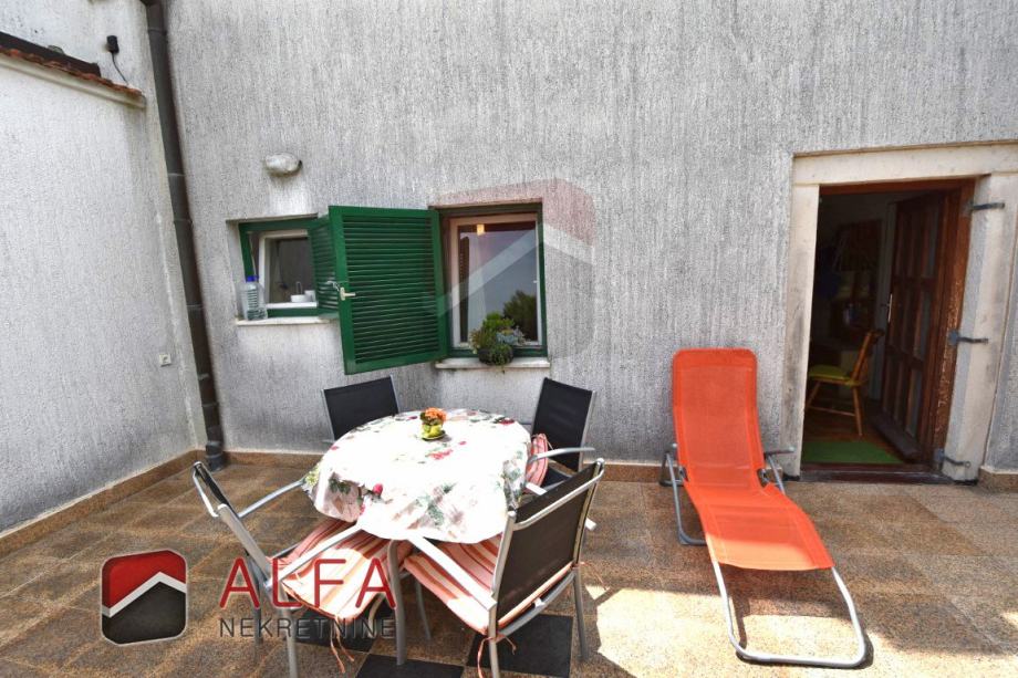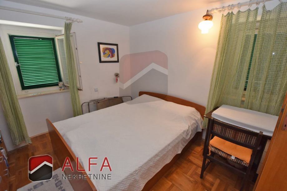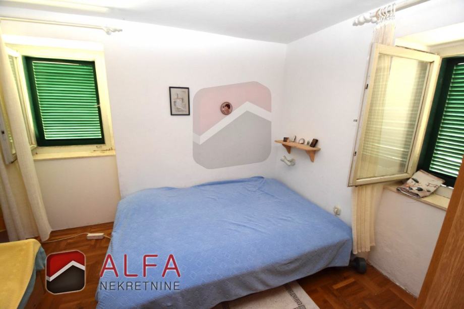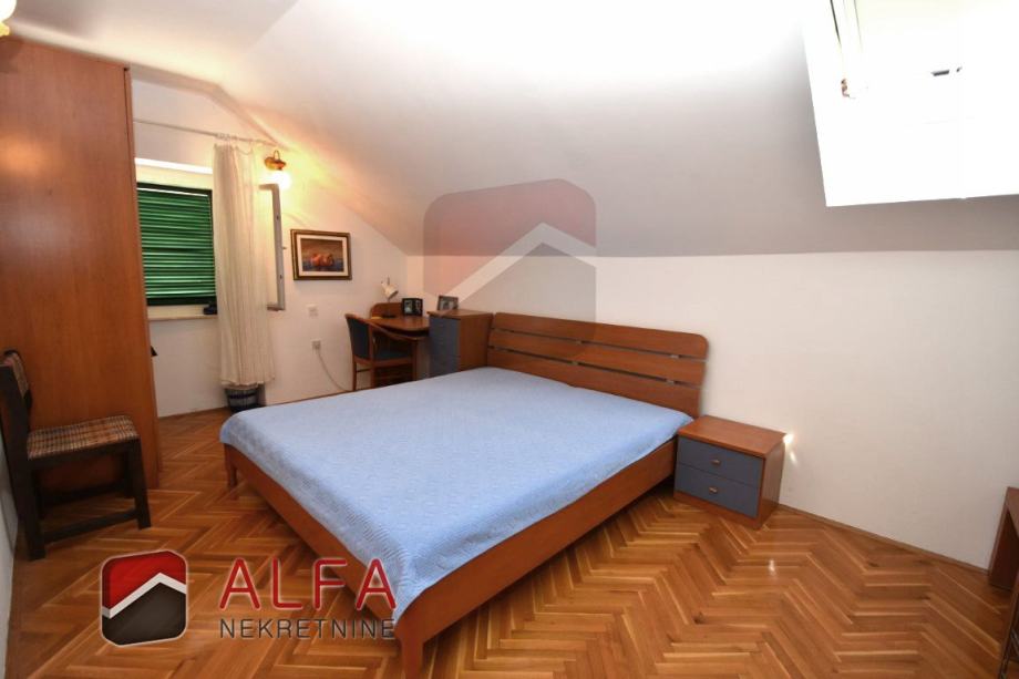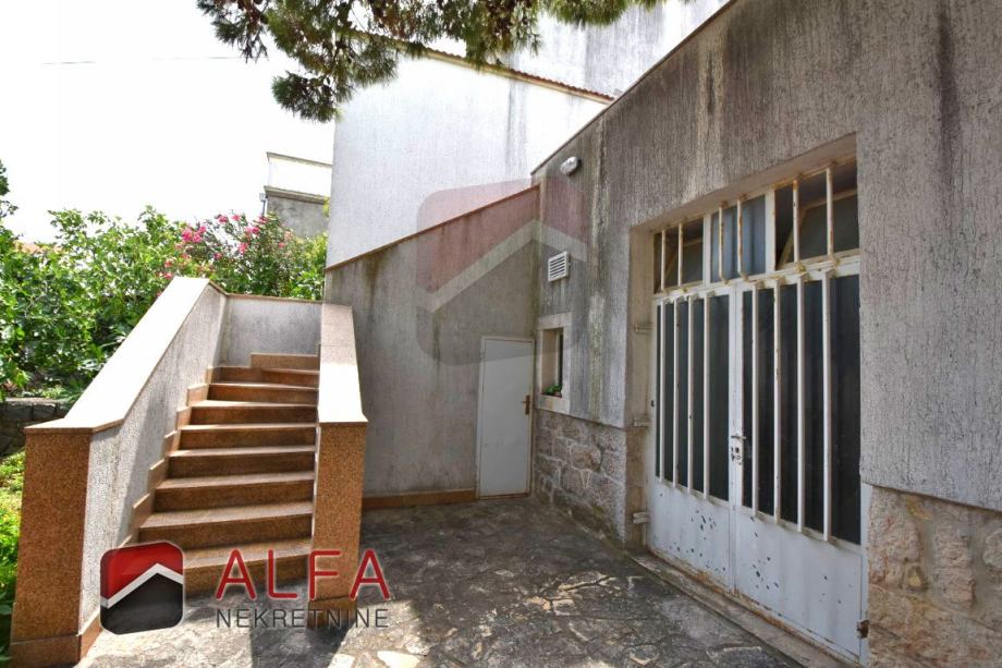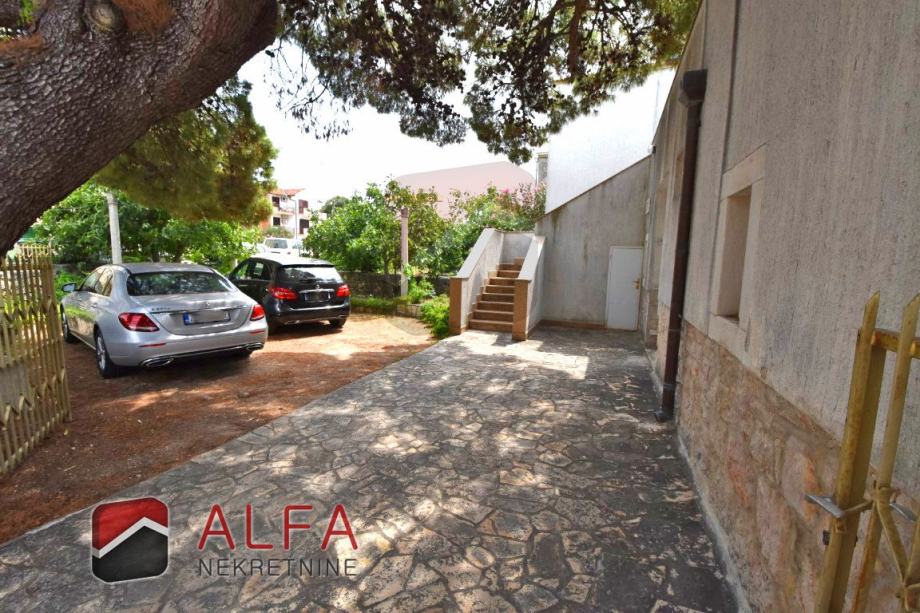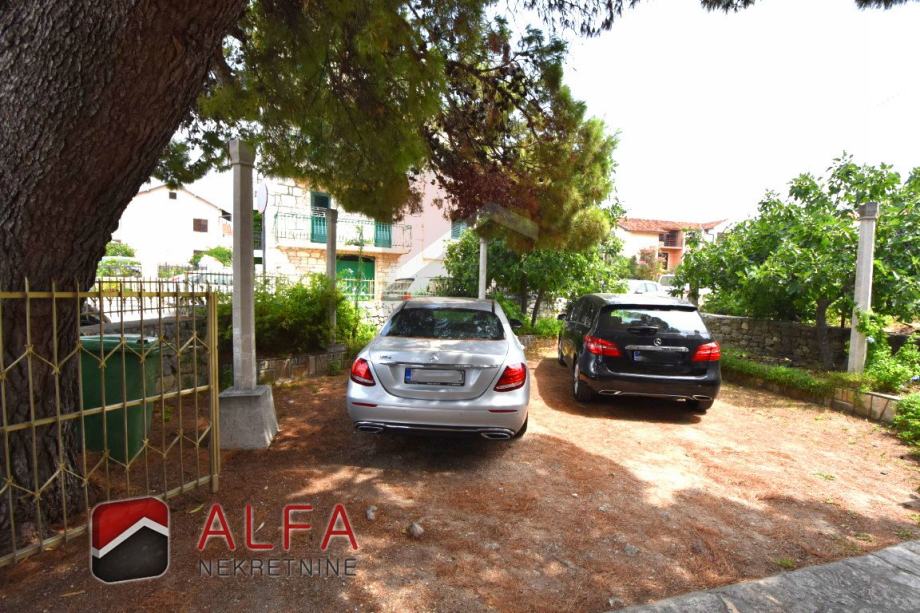 U stražnjem dijelu kuće je lijepo dvorište u zelenilu i hladovini velikog bora i drugog mediteranskog bilja. Tu ima prostora za parkiranje nekoliko automobila kao i za eventualno izgradnju bazena.