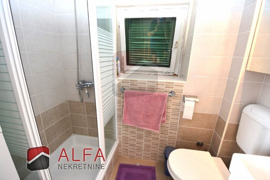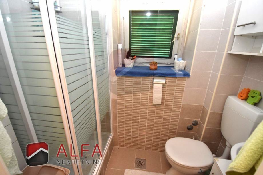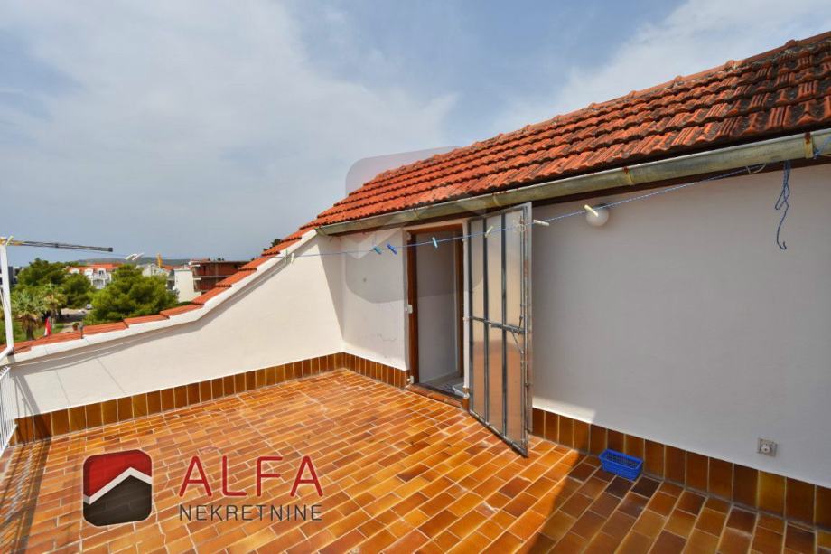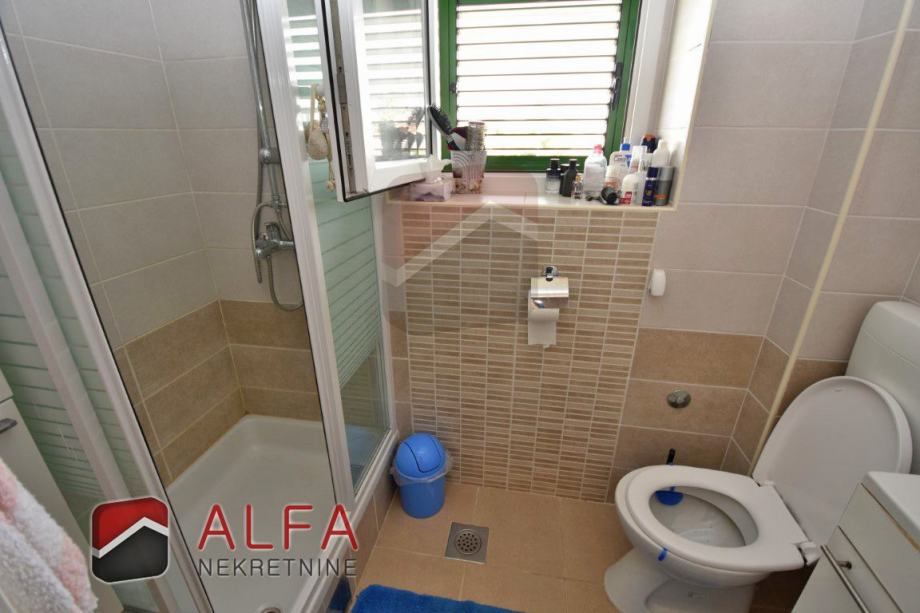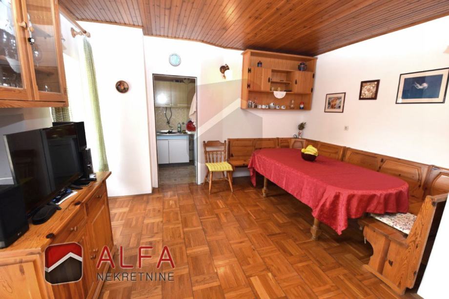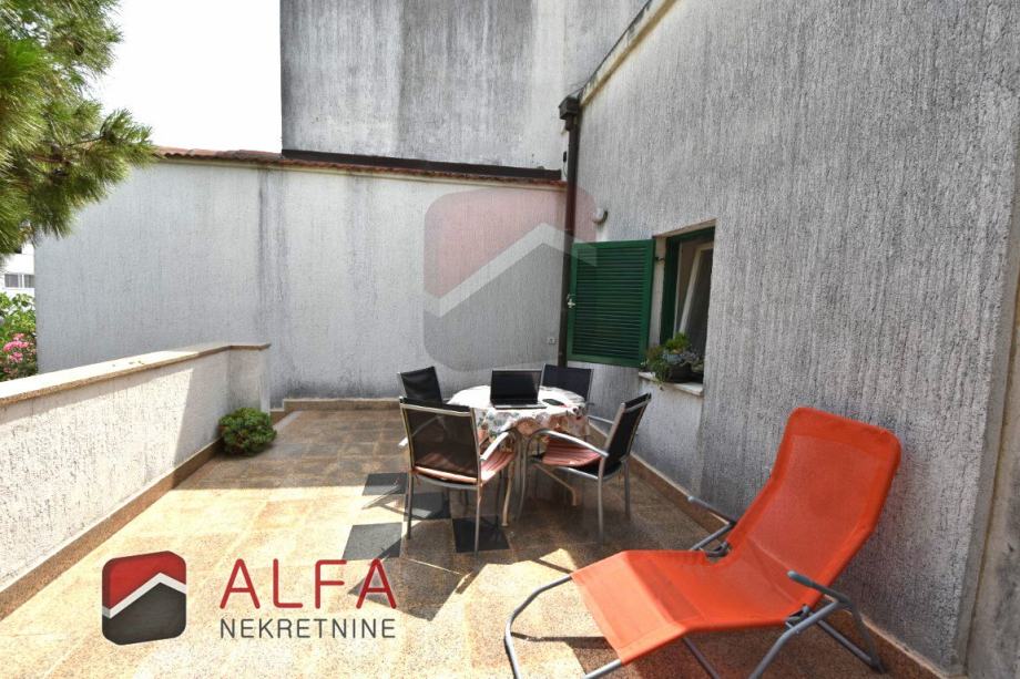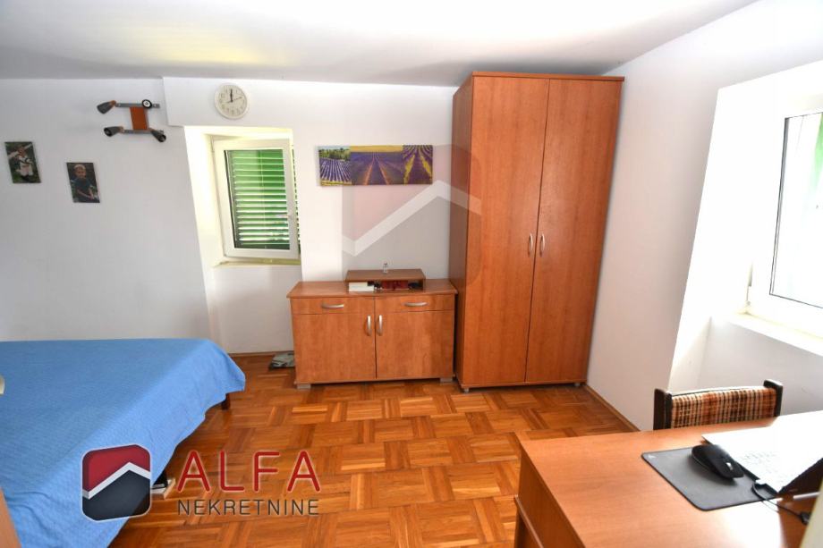 U stražnjem dijelu kuće je lijepo dvorište u zelenilu i hladovini velikog bora i drugog mediteranskog bilja. Tu ima prostora za parkiranje nekoliko automobila kao i za eventualno izgradnju bazena.