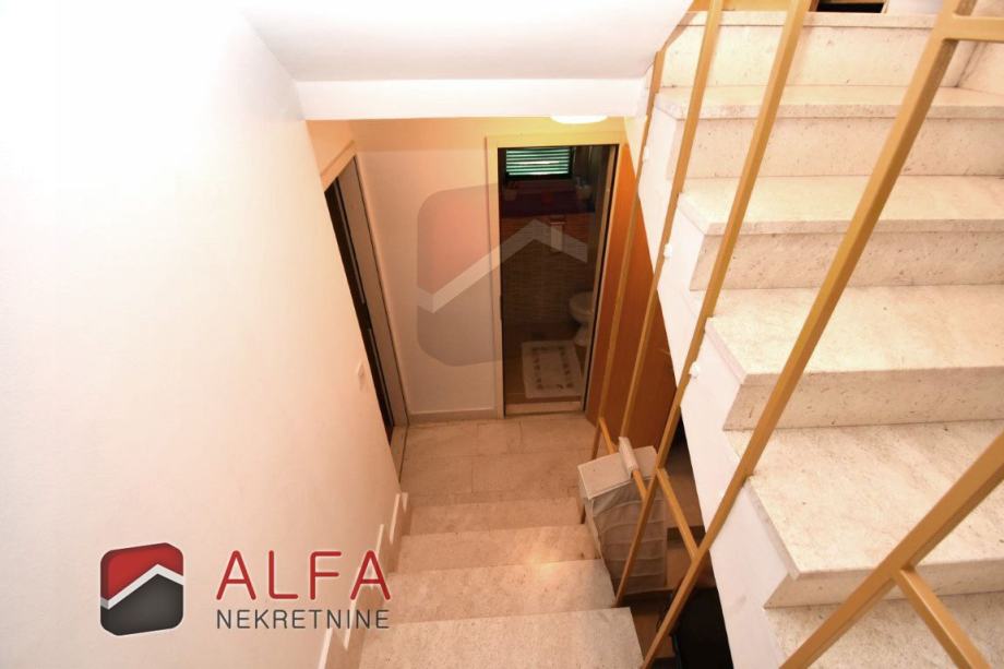Glavni ulaz u kuću je na prvom katu do kojeg se dolazi vanjskim stepenicama s dvorišne strane. Na toj etaži je velika terasa okružena prirodnim zelenilom i hladovinom, okrenuta na dvorišnu stranu. S terase se ulazi u stambeni dio gdje je kuhinja, blagovaonica / dnevni boravak, te jedna spavaća soba. Na gornjim međukatovima su raspoređene još 4 spavaće sobe, 3 kupaonice i hodnici. Na najgornjoj etaži je lijepa velika terasa sa prekrasnim panoramskim pogledom na šetnicu, lučicu i na more.