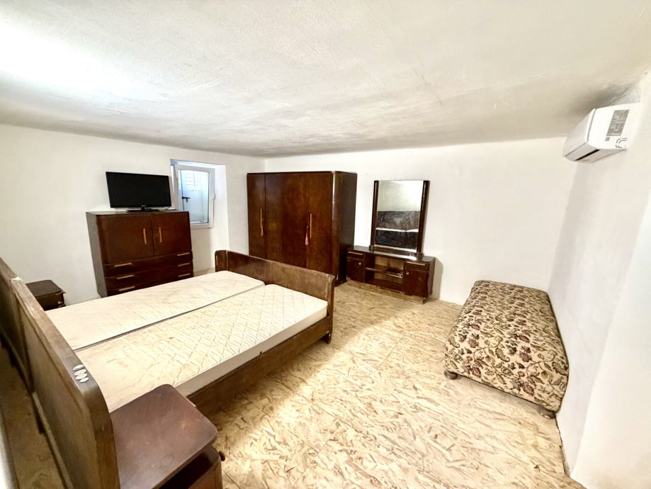 Okućnica uredno ograđena pravokutnog oblika na ravnom terenu sa dodatnom konobom tlocrtno 36m2 na kat za uredit , moguće apartman urediti .