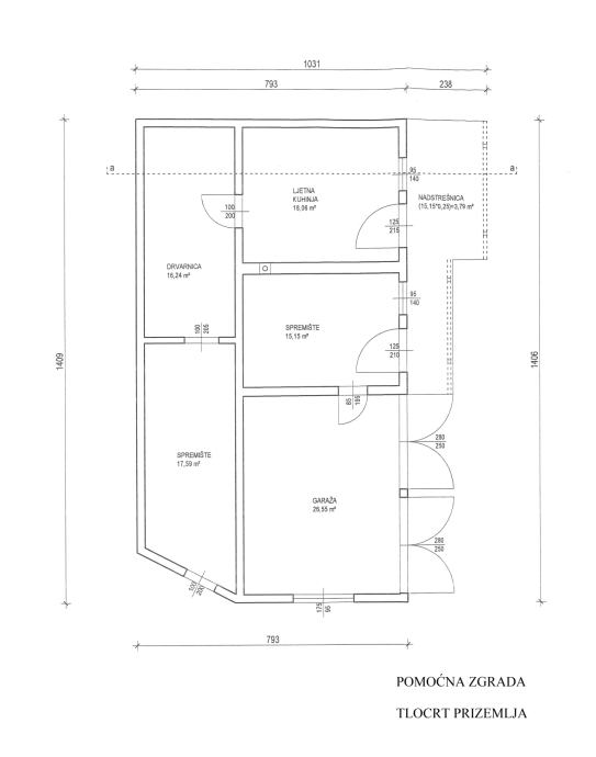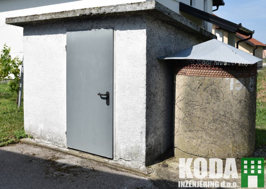 Iza kuće, u dvorištu se nalazi i pomoćna građevina-garaža s ljetnom kuhinjom i spremištem, nadstrešnica i kućica za hidrofor.