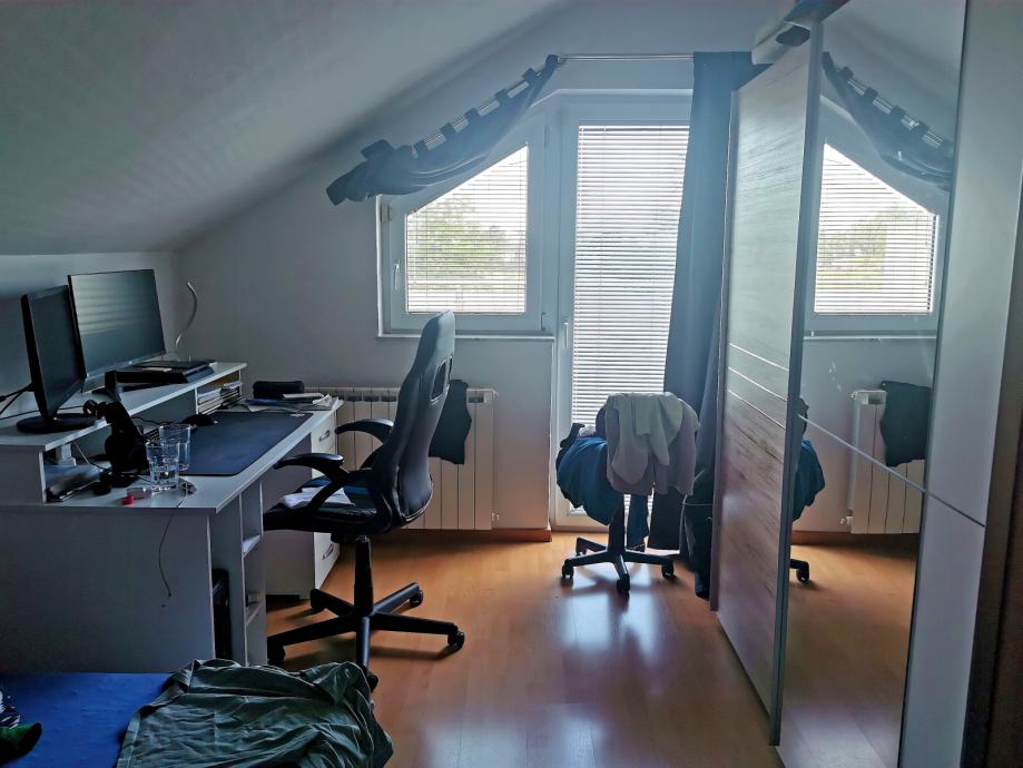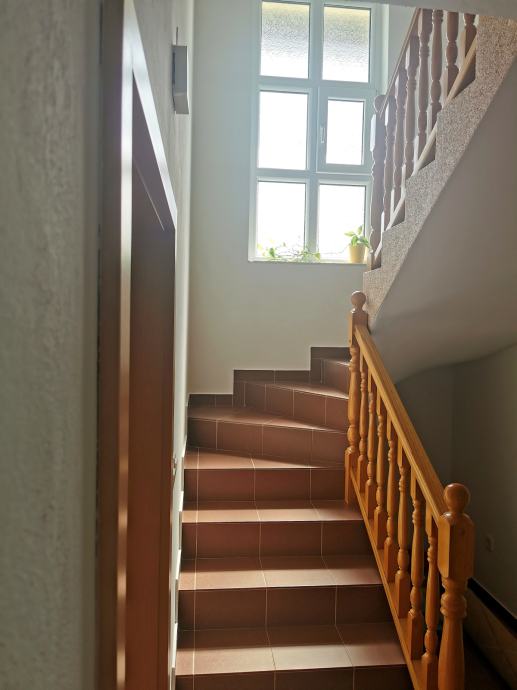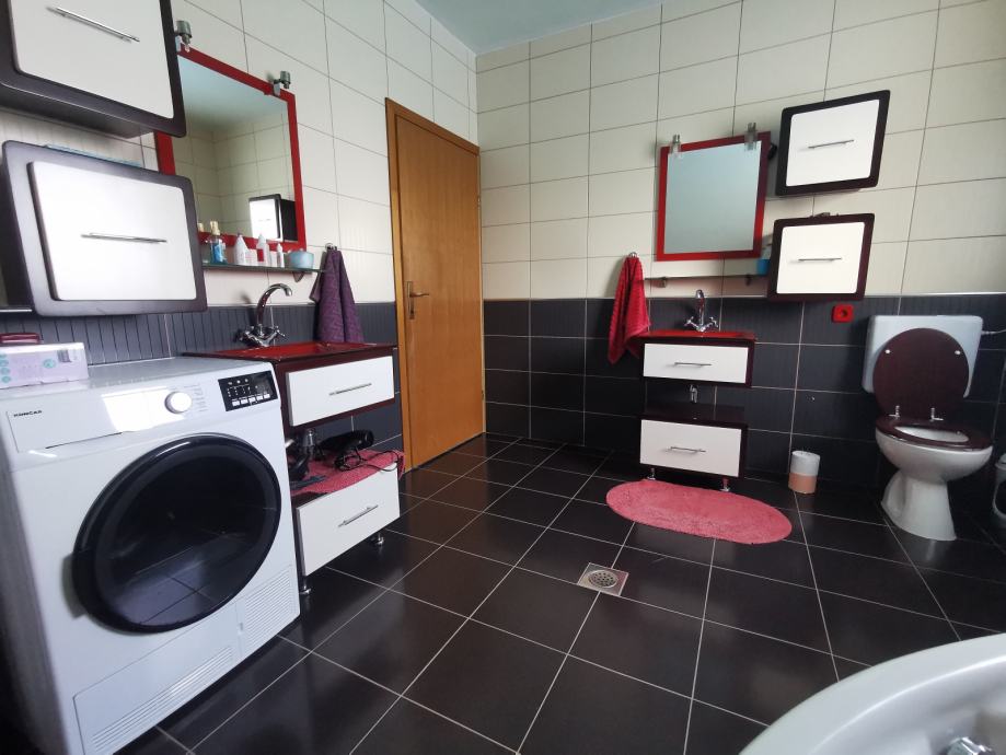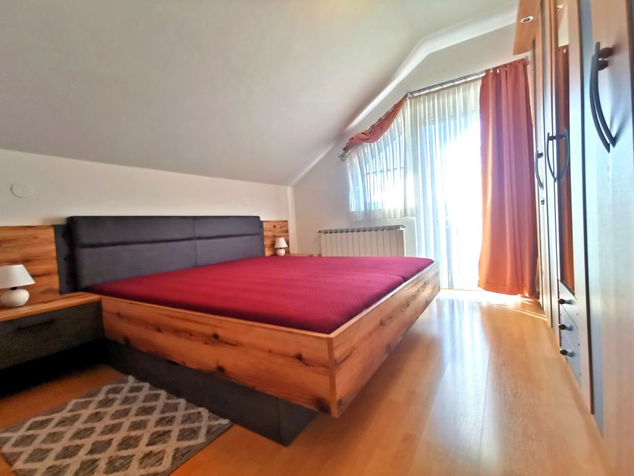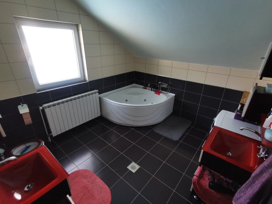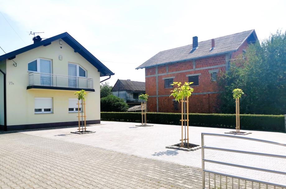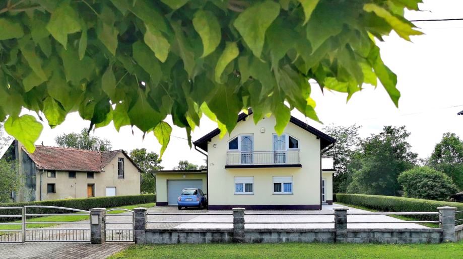 Kuća, potpuno namještena, u mirnom dijelu grada. U prizemlju se nalaze: kupaonica (6,10 m2), dnevni boravak (13,6 m2), kuhinja s blagavaonicom (16,15 m2), radna soba 10,5 m2), hodnik (13 m2) i stubište za na kat. Na katu se nalaze: spavaća soba (13,5 m2), sjeverna dječja soba (14,15 m2), južna dječja soba (13,15 m2), te velika kupaonica sa jacuzzi kutnom kadom (10,5 m2). Sa južne strane u sklopu kuće nalazi se teretana sa wc-om (45 m2) s mogućnošću prenamjene u stambeni prostor (sprave u teretani nisu u cijeni kuće!), a iznad nje je terasa sa montažnim bazenom (53 m2), tendom, ležaljkama i vrtnom garniturom. U sklopu kuće je također i garaža (26 m2), te veliki parking ispred kuće (250 m2). Kuća je pod video nadzorom i alarmnim sustavom. U objektu su tri klima uređaja. Centralno grijanje na plin je razvedeno po svim prostorijama uključujući i garažu. Udaljenost od centra je 800m, željezničkog kolodvora 350m i autobusnog kolodvora 1500m. Kuća se nalazi 1500m od osnovnih i srednje škole, vrtića i shoping centara.Posjedujemo vlasnički list i uporabnu dozvolu. U objekt nisu potrebne nikakve dodatne investicije! (U TIJEKU JE SADNJA DRVEĆA NA PARKIRALIŠTU ISPRED KUĆE!)