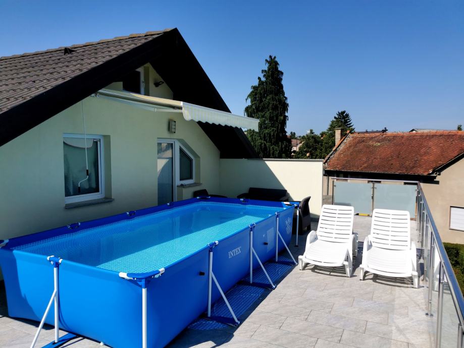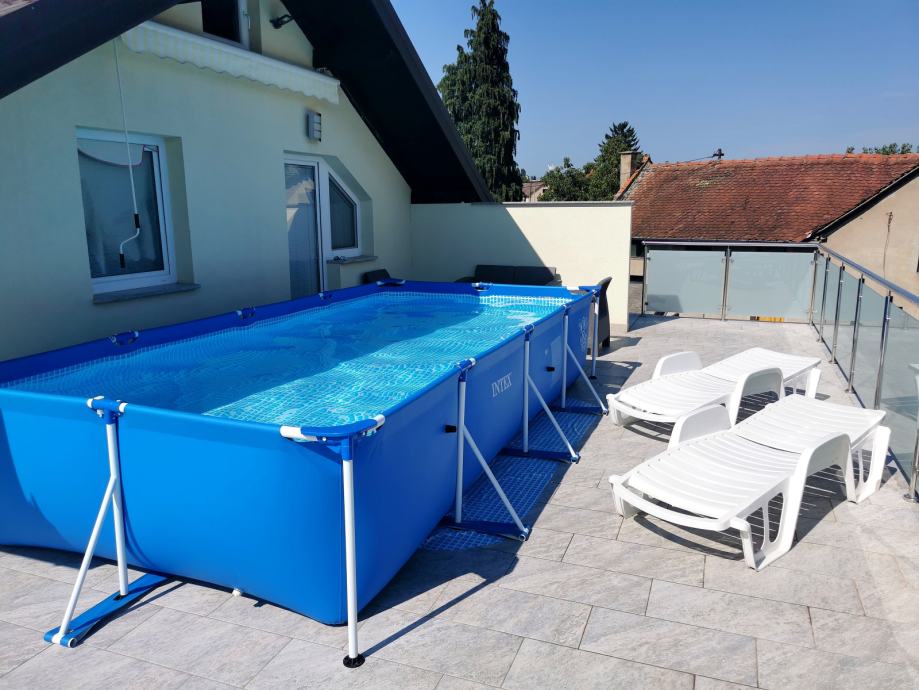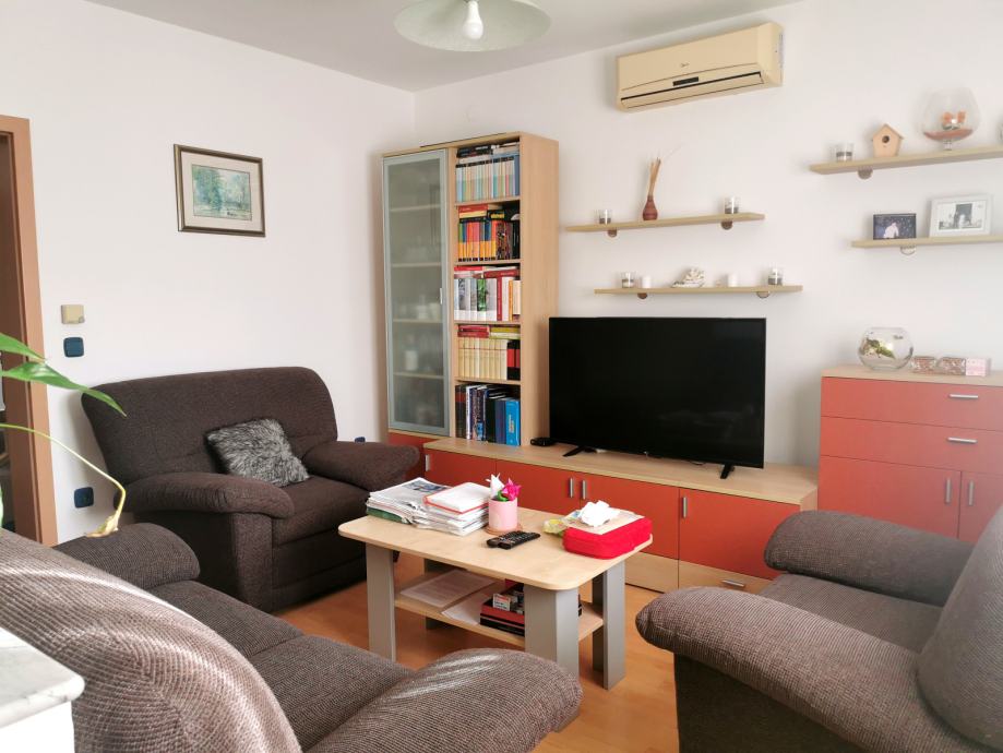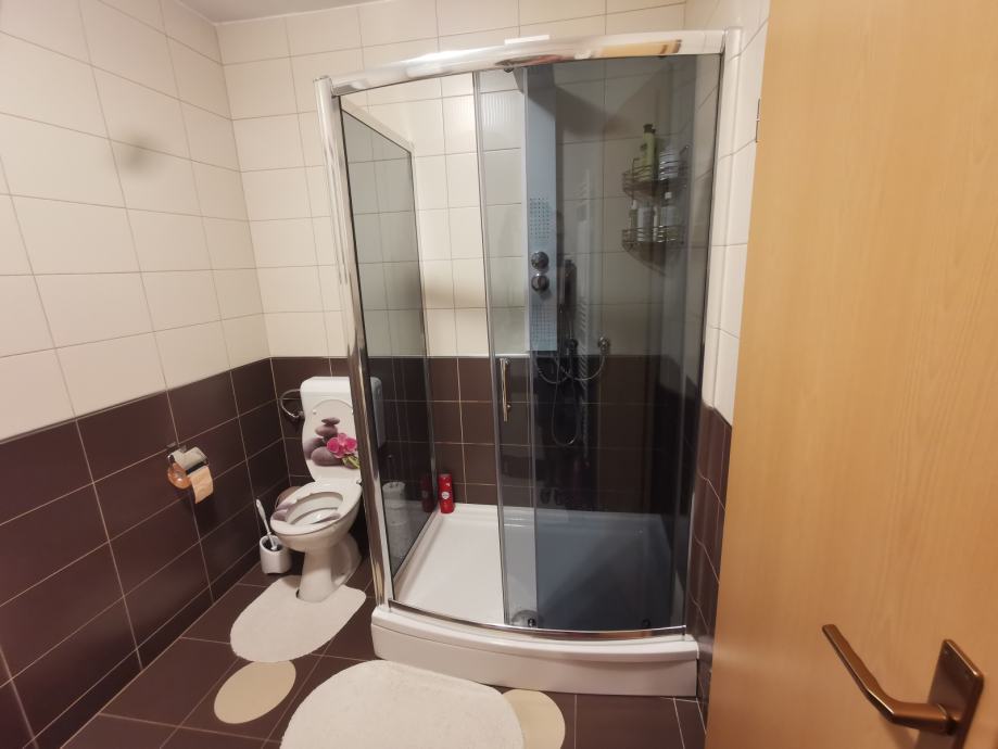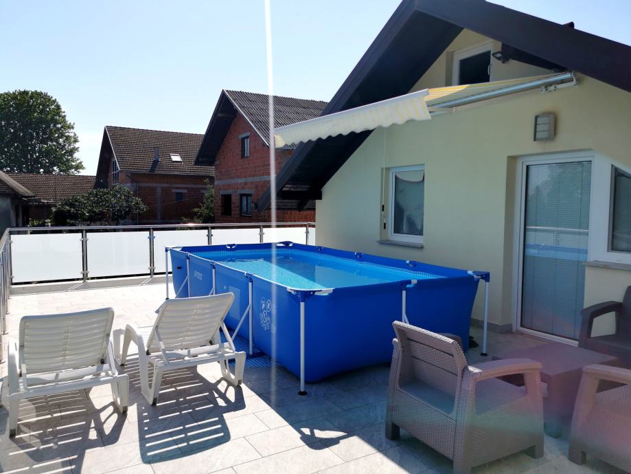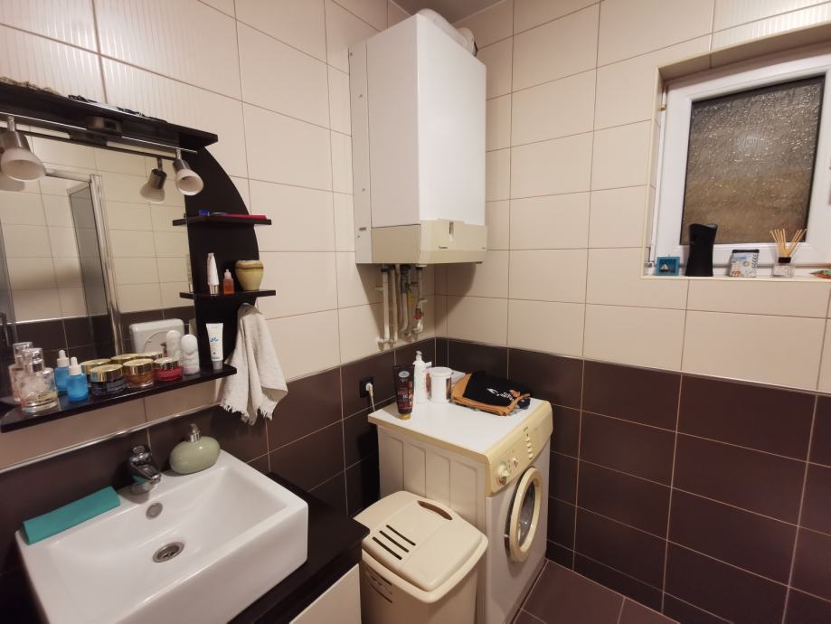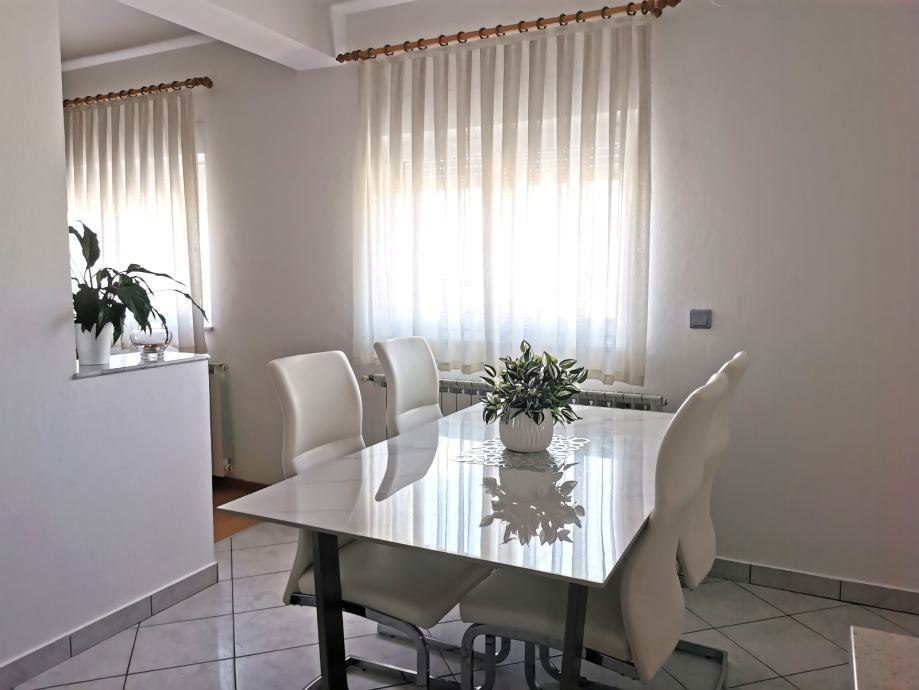 Kuća, potpuno namještena, u mirnom dijelu grada. U prizemlju se nalaze: kupaonica (6,10 m2), dnevni boravak (13,6 m2), kuhinja s blagavaonicom (16,15 m2), radna soba 10,5 m2), hodnik (13 m2) i stubište za na kat. Na katu se nalaze: spavaća soba (13,5 m2), sjeverna dječja soba (14,15 m2), južna dječja soba (13,15 m2), te velika kupaonica sa jacuzzi kutnom kadom (10,5 m2). Sa južne strane u sklopu kuće nalazi se teretana sa wc-om (45 m2) s mogućnošću prenamjene u stambeni prostor (sprave u teretani nisu u cijeni kuće!), a iznad nje je terasa sa montažnim bazenom (53 m2), tendom, ležaljkama i vrtnom garniturom. U sklopu kuće je također i garaža (26 m2), te veliki parking ispred kuće (250 m2). Kuća je pod video nadzorom i alarmnim sustavom. U objektu su tri klima uređaja. Centralno grijanje na plin je razvedeno po svim prostorijama uključujući i garažu. Udaljenost od centra je 800m, željezničkog kolodvora 350m i autobusnog kolodvora 1500m. Kuća se nalazi 1500m od osnovnih i srednje škole, vrtića i shoping centara.Posjedujemo vlasnički list i uporabnu dozvolu. U objekt nisu potrebne nikakve dodatne investicije! (U TIJEKU JE SADNJA DRVEĆA NA PARKIRALIŠTU ISPRED KUĆE!)