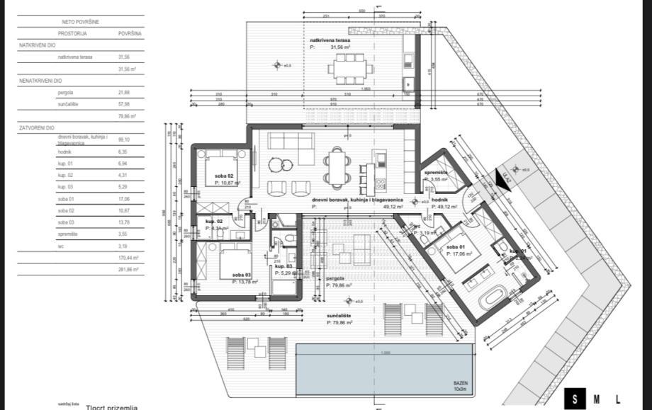 – Vanjski prostor: natkrivena terasa, pergola i sunčalište