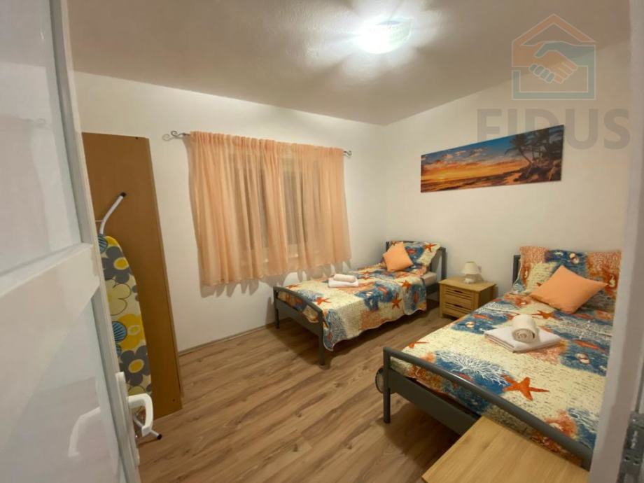 Jednosobni stan u prizemlju se sastoji od kuhinje 7,80 m2, kupaonice 2,60 m2, hodnika 1,35 m2, dvije sobe površine 12,15 m2 i 4,45 m2 te natkrivene terase površine 10,30 m2 (obračunska površina 2,57 m2), a dvosobni stan od ostave 2,80 m2, kuhinje 6,00 m2, kupaonice 4,45 m2, dnevnog boravka 14,80 m2, dvije sobe površine 9,50 m2 i 11,45 m2 te natkrivene terase površine 10,20 m2 (obračunska površina 2,55 m2).