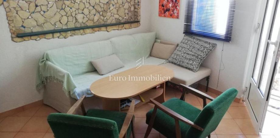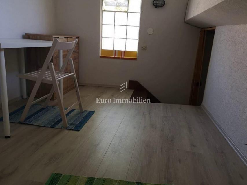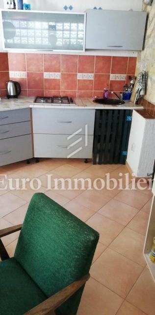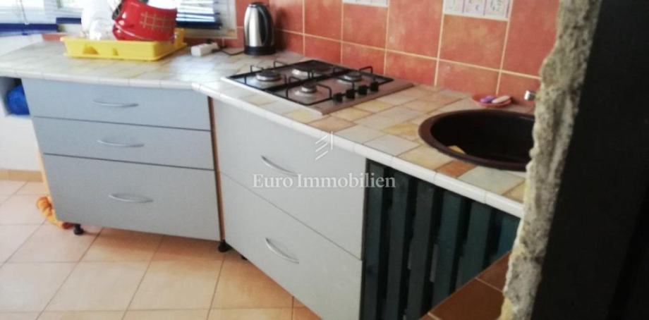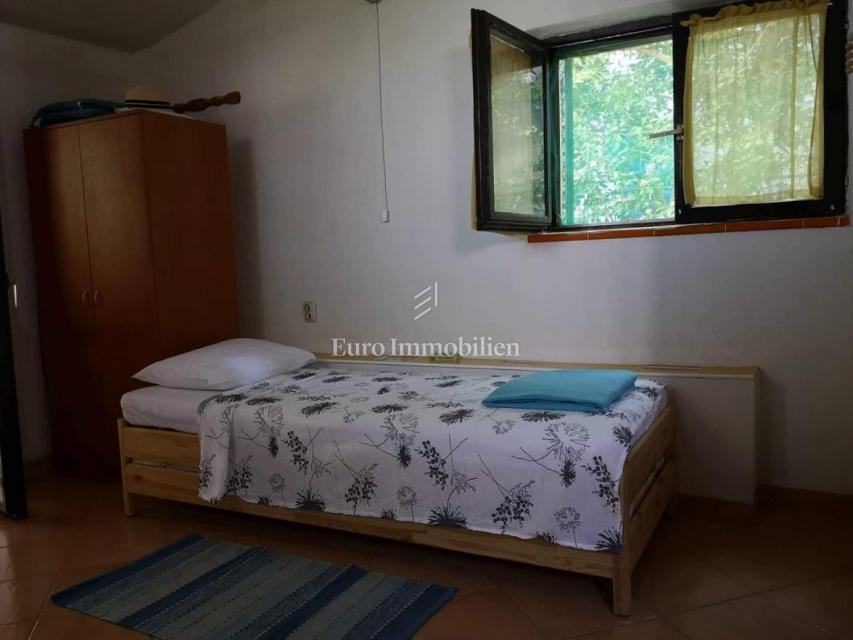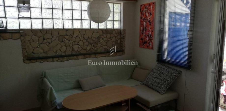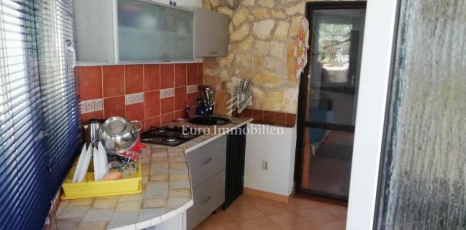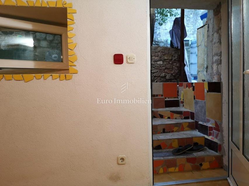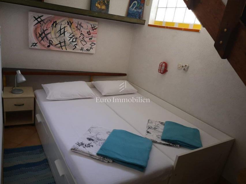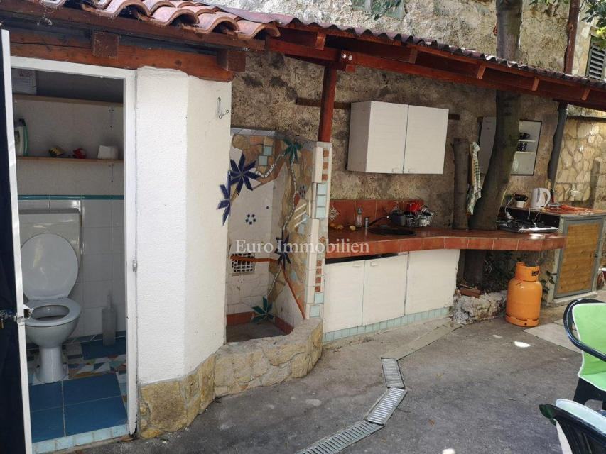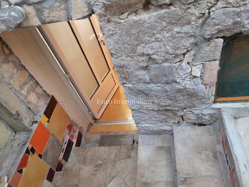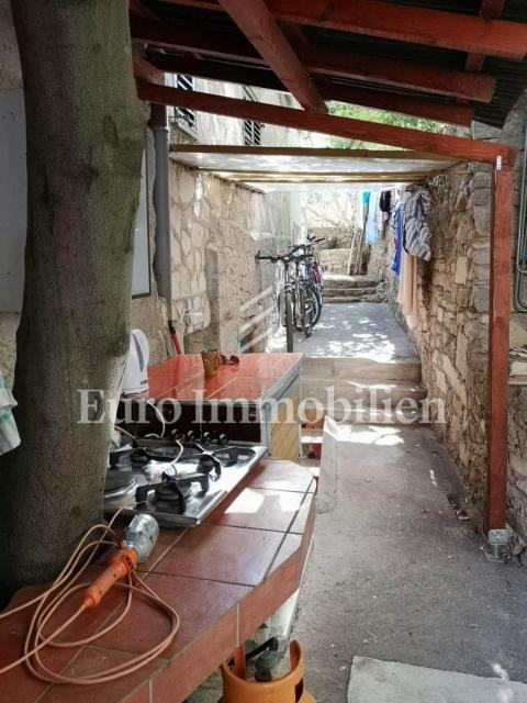 Kuća površine 53 m2 sastoji se od kuhinje i dnevnog boravka, velike sobe, kupaonice te galerije na katu. Na vrhu kuće nalazi se terasa. Kući pripada i malo spremište od 3 m2. Dvorište ima 90 m2, te se dijeli na prednje i stražnje. U prednjem dvorištu je mali vrt (betonirani dio je za mjesto za druženje), te vanjski tuš s bojlerom. Do stražnjega dvorišta dolazi se kroz mali prolaz, tamo se nalazi vanjska kuhinja i kućica gdje se može smjestiti hladnjak ili perilica rublja, još jedan vanjski tuš, vanjski toalet za goste, te veliko spremište od cca 15 m2. Stražnje dvorište je većinu dana u hladu što je za ljetne vrućine idealno. U sklopu kuće se nalazi i konoba u koju se ulazi kroz stražnje dvorište. Nekretnina je koncipirana tako da stražnje dvorište s konobom može posebno funkcionirati. Kuća se nalazi na kraju slijepe ulice u mirnom i zelenom okruženju. U blizini je javni parking, udaljen je otprilike 50 m.