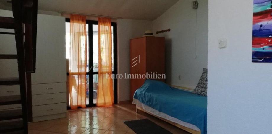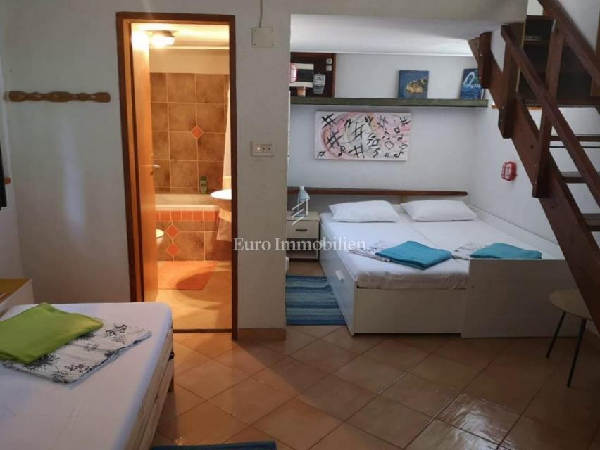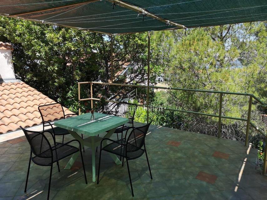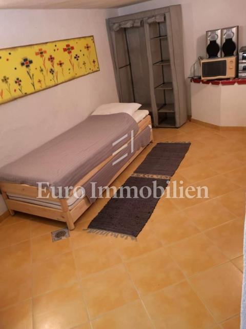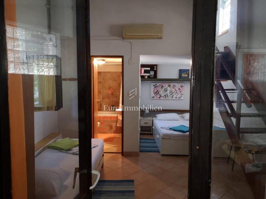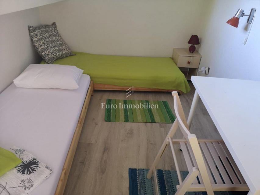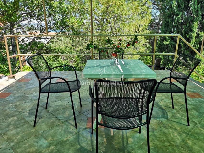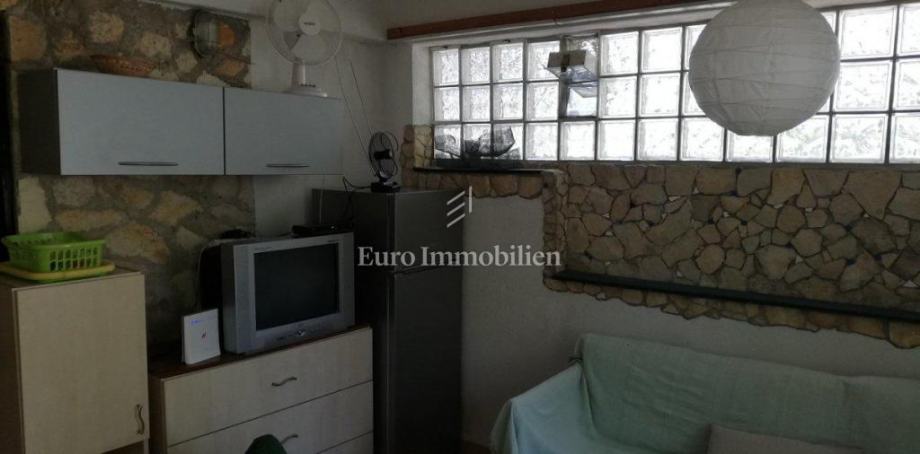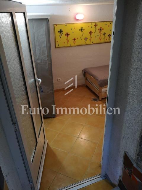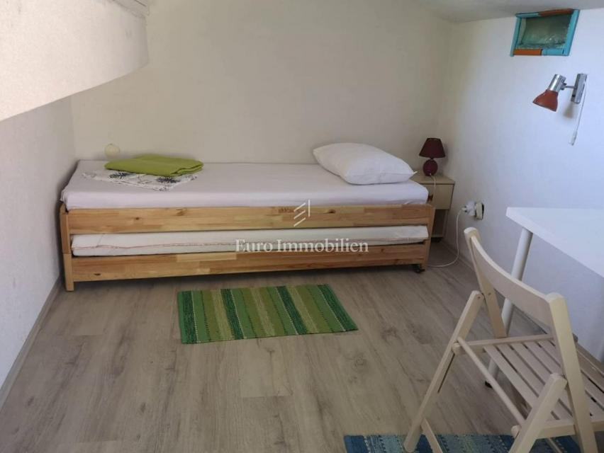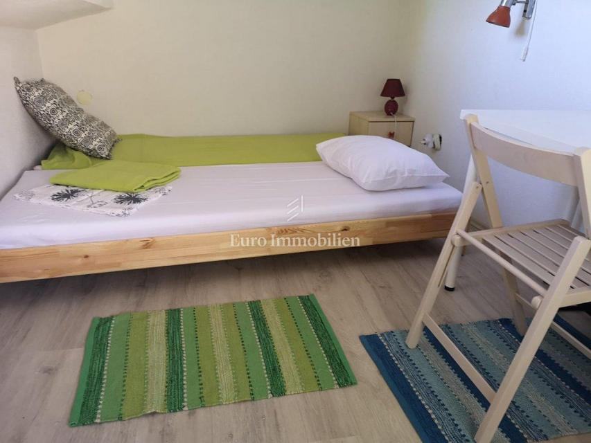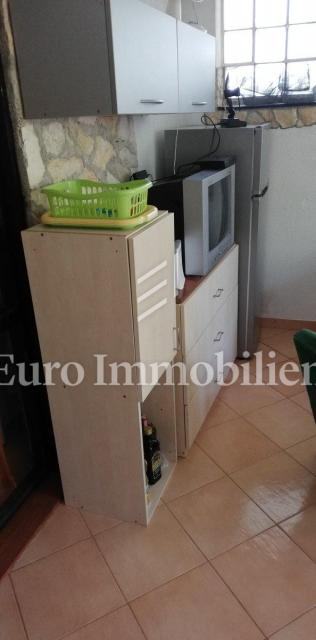Kuća površine 53 m2 sastoji se od kuhinje i dnevnog boravka, velike sobe, kupaonice te galerije na katu. Na vrhu kuće nalazi se terasa. Kući pripada i malo spremište od 3 m2. Dvorište ima 90 m2, te se dijeli na prednje i stražnje. U prednjem dvorištu je mali vrt (betonirani dio je za mjesto za druženje), te vanjski tuš s bojlerom. Do stražnjega dvorišta dolazi se kroz mali prolaz, tamo se nalazi vanjska kuhinja i kućica gdje se može smjestiti hladnjak ili perilica rublja, još jedan vanjski tuš, vanjski toalet za goste, te veliko spremište od cca 15 m2. Stražnje dvorište je većinu dana u hladu što je za ljetne vrućine idealno. U sklopu kuće se nalazi i konoba u koju se ulazi kroz stražnje dvorište. Nekretnina je koncipirana tako da stražnje dvorište s konobom može posebno funkcionirati. Kuća se nalazi na kraju slijepe ulice u mirnom i zelenom okruženju. U blizini je javni parking, udaljen je otprilike 50 m.