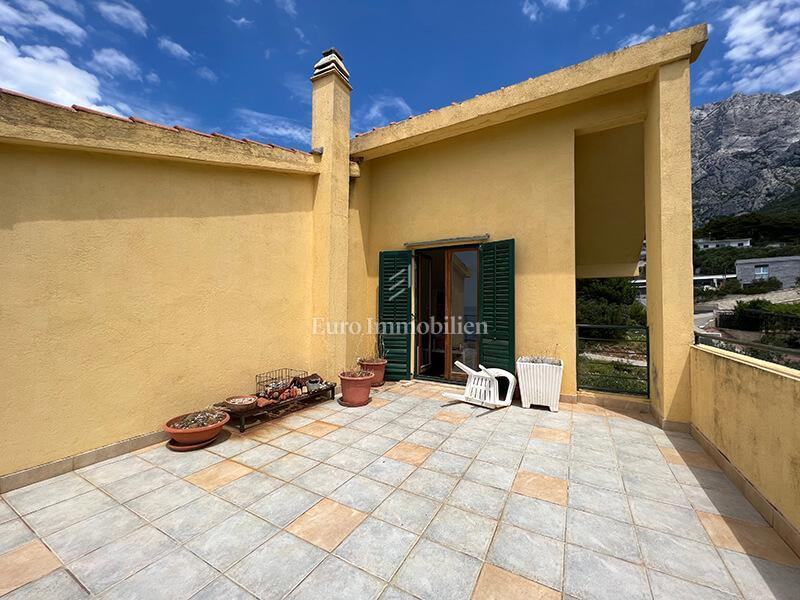 Kuća ima površinu 171,70 m2, a proteže se na 3 etaže - prizemlje i dva kata, sastoji se od dva apartmana, a izgrađena je na zemljištu površine 213 m2. U prizemlju se nalazi jednosoban apartman – kuhinja i blagovaonica, dnevni boravak, kupaonica, spavaća soba, terasa i prostrani vrt sa mediteranskim biljem na kojem je moguća gradnja bazena. Prvi i drugi kat se sastoji od dvoetažnog trosobnog apartmana - kuhinja i blagovaonica, dnevni boravak, spavaća soba, kupaonica i dvije lođe na donjoj etaži, te dvije spavaće sobe, balkon i velika terasa površine 20 m2 na gornjoj etaži. Namještena je i klimatizirana,ali joj je potrebna djelomična renovacija. Kvalitetno građena nekretnina u autohtonom dalmatinskom stilu. Južno orijentirana, a sa svakog kata kuće se pruža fantastičan panoramski pogled na more, otoke i Makarsku. Sa strane kuće je na raspolaganju parking za jedno vozilo.
