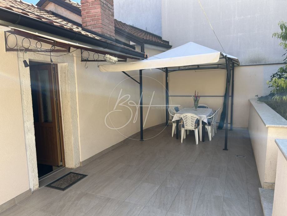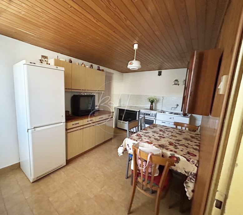 U prizemlju se nalazi funkcionalna ljetna kuhinja, ostava, kupaonica te dodatna prostorija s posebnim vanjskim ulazom. Upravo ta prostorija pruža poseban potencijal — može se urediti kao poslovni prostor, studio ili hobi-soba, ovisno o potrebama budućeg vlasnika. Unutarnje stepenice vode na kat na kojem se smjestila svijetla kuhinja s blagovaonicom, dnevni boravak, spavaća soba te izlaz na prostranu terasu i zeleni vrt. Terasa je dovoljno velika za uživanje u toplim danima, a posebnu čar daje joj dekorativni kameni sudoper.