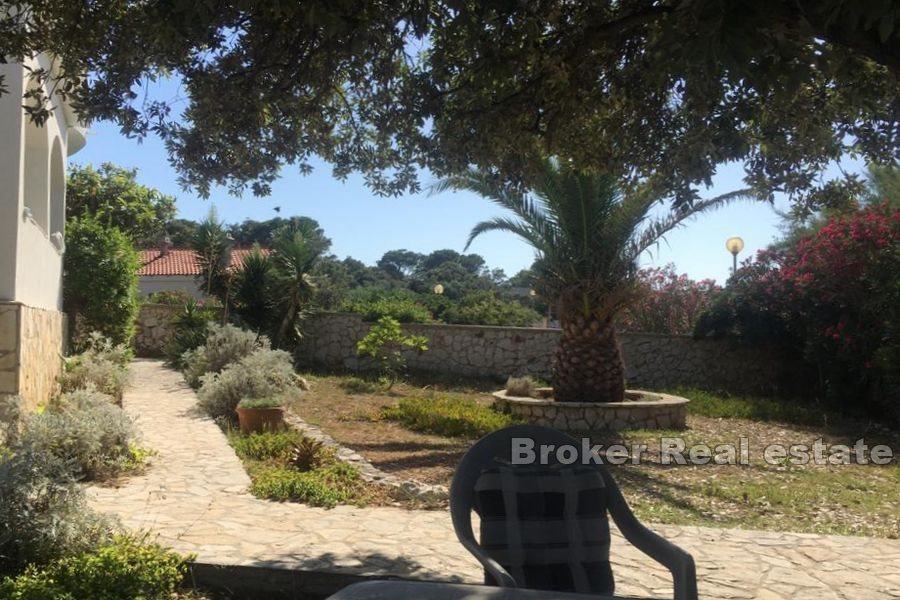 Ova nekretnina proteže se na dvije etaže plus podrum.Cijelom prizemnom etažom proteže se veliki stan koji se sastoji od Dnevnog boravka , kuhinje, blagovaonice, dvije spavaće sobe, kupaonice i Velike terase ukupne stambene površine 95 m2. Na prvome katu se nalaze dva zasebna apartmana sa zasebnim ulazima. Svaki apartman ima ulazni hodnik, kuhinju sa dnevnim boravkom i blagovaonicom, spavaću sobu, kupatilo i terasu sa koje puca pogled na kristalno čisto more. Ukupna površina apartmana iznosi 95 m2. Kuća također ima veliki vrt obogaćen zelenilom, konobu i ostavu. Prije nekolio godina renoviran fasada i postavljena nova pvc stolarija.
