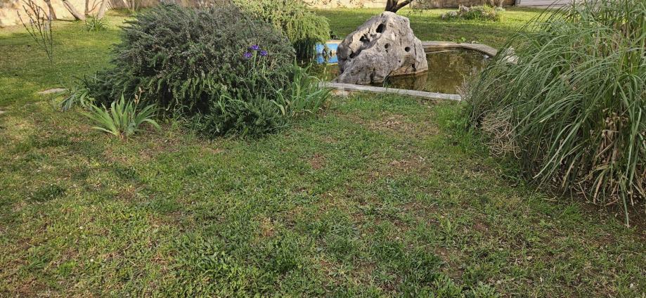 Parcela je ograđena sa 3 strane, dvorište asfaltirano. Druga parcela 2371/4 , 600 m2 Park sa maslinama i ribnjakom ispred do glavne ceste, ulaz sa glavne ceste.