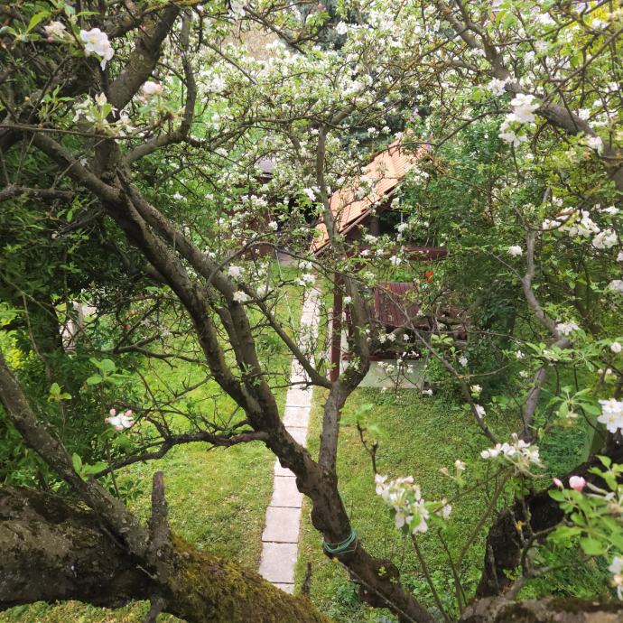 Na katu su dvije spavaće sobe, kupaonica s toaletom i veliki dnevni boravak s izlazom na balkon.