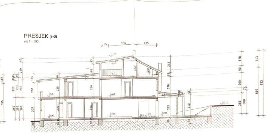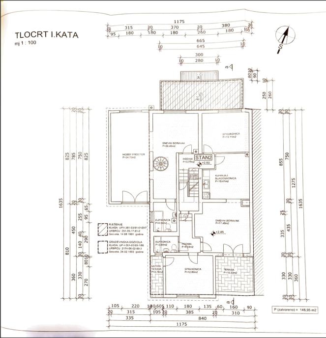 na prvom katu se nalazi stan povrsine brutto 154m2 a sastoji se od ( 2 spavace sobe, 2 boravka, kupaone, 2 WC-a, hobby prostorije, hodnika, terase, kuhinje s blagavaonom)