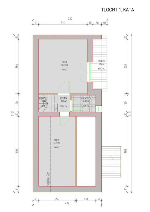 1. kat: 2 spavaće sobe, kupaonica, balkon