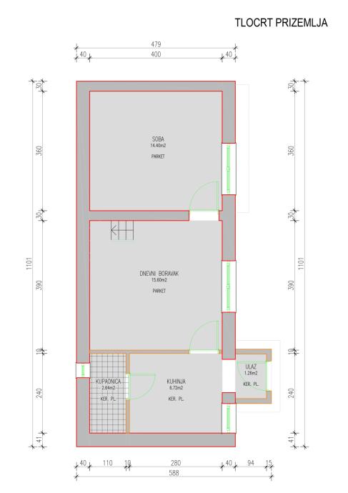 Prizemlje: ulazni prostor, kuhinja, kupaonica, dnevni boravak, 1 spavaća soba