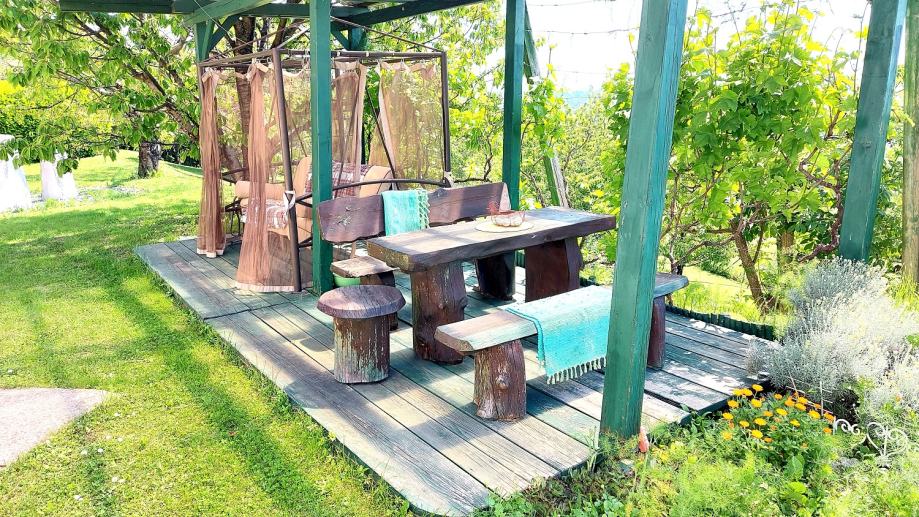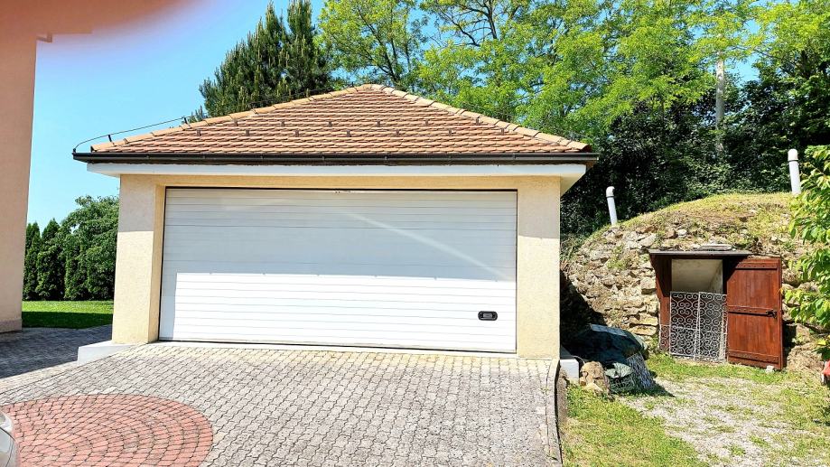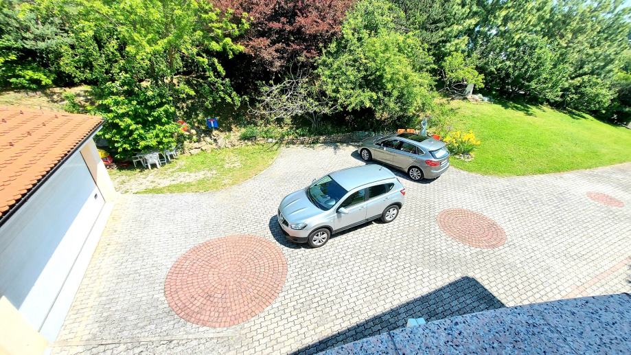 Tavan je velike visine što također nudi mogućnost stambene definicije. U dvorištu je garaža za 2 automobila i opločen parking za 3 do 4 gostinska automobila. Pored garaže nalazi se u kamenu ukopani podrum-spremište za čuvanje zimnice s temperaturom od 7 do 14" C. Oko kuće nalaze se sjenice i prostori za odmaranje i uživanje u idili pogleda na Grad kako danju tako i na večer. Također, kuća ima svoju spremu vode za vanjske potrebe i održavanje okućnice. U dvorišnom dijelu postoji dio kao predviđena mogućnost za heliodrom-spuštanje helikoptera za osobne potrebe. Kuća je upisana u zemljišne knjige, ima Građ. i Uporabnu dozvolu.