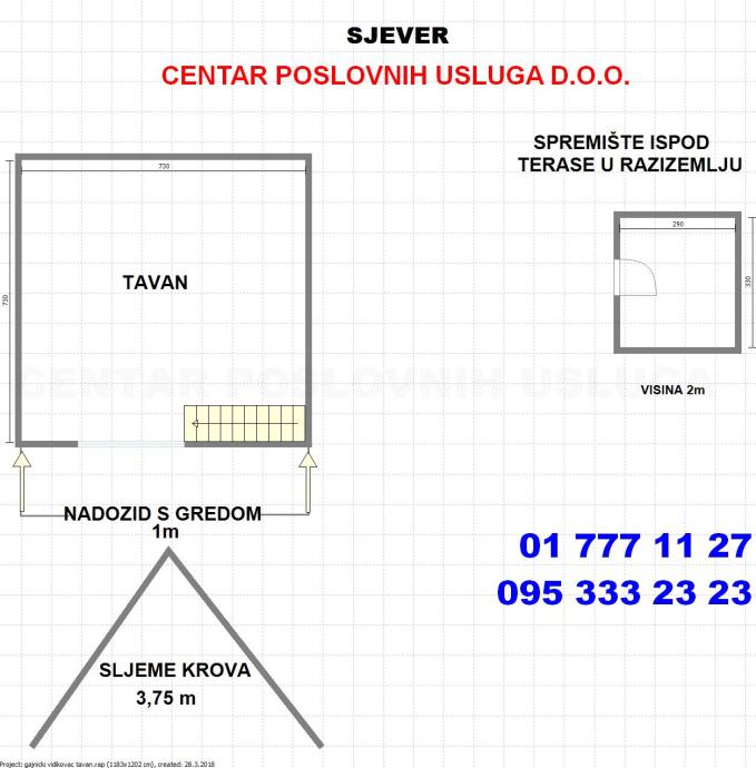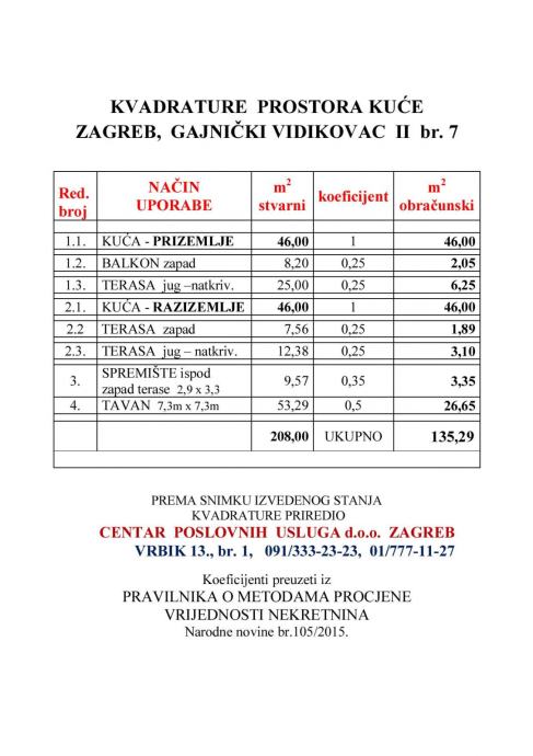 KUĆA je samostojeća vanjskih gabarita 7,8m x 7,8m; čiste stambene površine oko 92 m2 u dvije etaže, a sa pripadcima: balkon, terase, tavan, spremište oko 208 m2 (pogledati tablicu kvadratura).