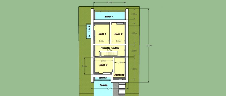 II kat se sastoji od: hodnika, kupaonice i tri spavaće sobe sa pripadajućim balkonima.