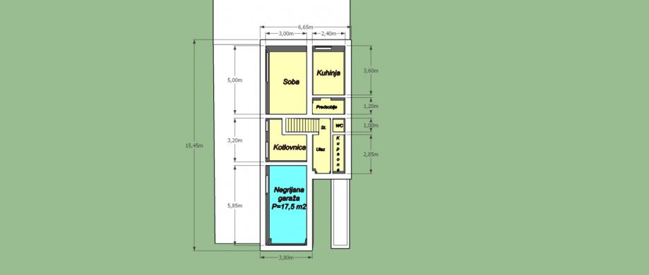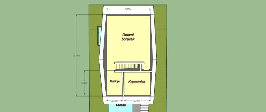 Prizemlje se sastoji od: ulaznog hodnika, kotlovnice, kupaonice, kuhinje sa blagovaonicom i dnevne sobe.