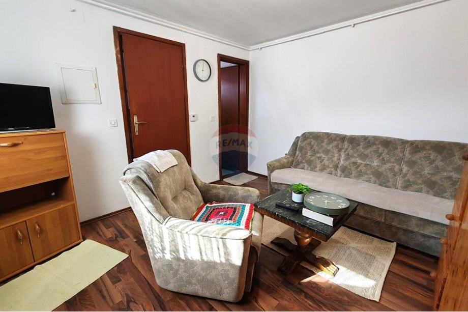U prednjoj kući tlocrtne površine 92 m2 nalaze se dva stana, jedan u prizemlju a drugi na katu. Svaki stan ima zasebni ulaz. Stan u prizemlju sastoji se od trijema, hodnika, dvije spavaće sobe, dnevnog boravka, kuhinje, ostave i kupaonice sa tuš kabinom. U gornji stan dolazi se po vanjskom zatvorenom stubištu i sastoji se od ulaznog hola, hodnika, dnevnog boravka, dvije spavaće sobe, kuhinje, kupaonice sa tuš kabinom, ostavom i malim natkrivenim balkonom. Stanovi su uređeni i održavani, prodaju se sa namještajem i odmah su useljivi. Prije 10 godina ugrađena je PVC stolarija, brušeni su i lakirani parketi te je na prvom katu renovirana kupaonica.