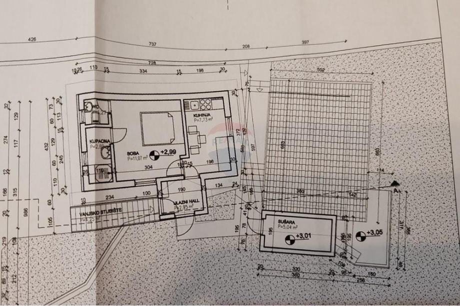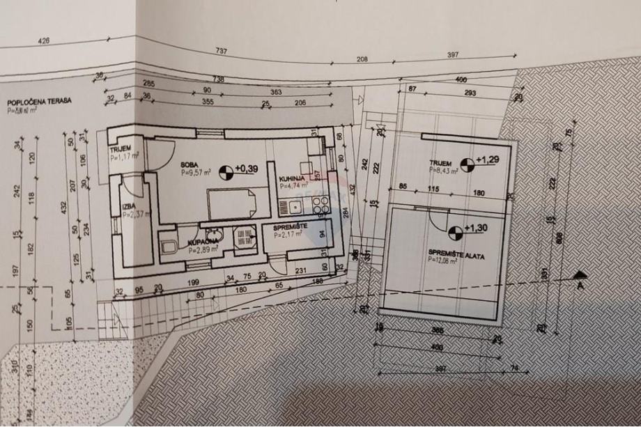 Osim dva stambena objekta na parceli se nalazi i pomoćna zgrada tlocrtne površine 40 m2 koja je legalizirana kao i prve dvije kuće, a u njoj se nalazi drvarnica, pušnica i spremište.