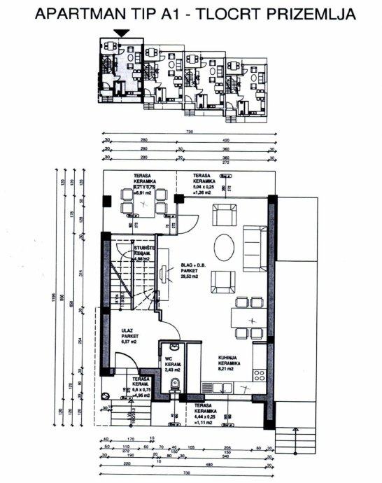 Kuća je zadnja u nizu te samim time ima dosta veću okučnicu i vrt te orijentaciju S-I-J