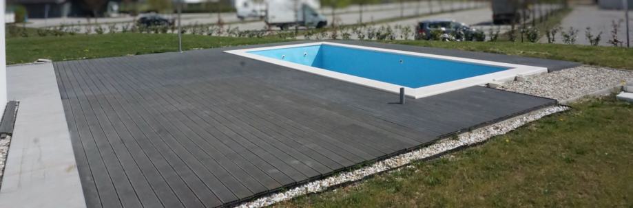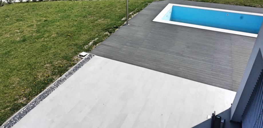 Prizemlje se sastoji od ulaznog trijema, hodnika sa stubištem za kat i podrum, prostranog dnevnog boravka sa izlazom na vanjsku terasu s bazenom (4x6 prostrani deking) i vrt površine 200m2, kuhinje s blagovaonicom.
