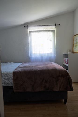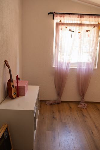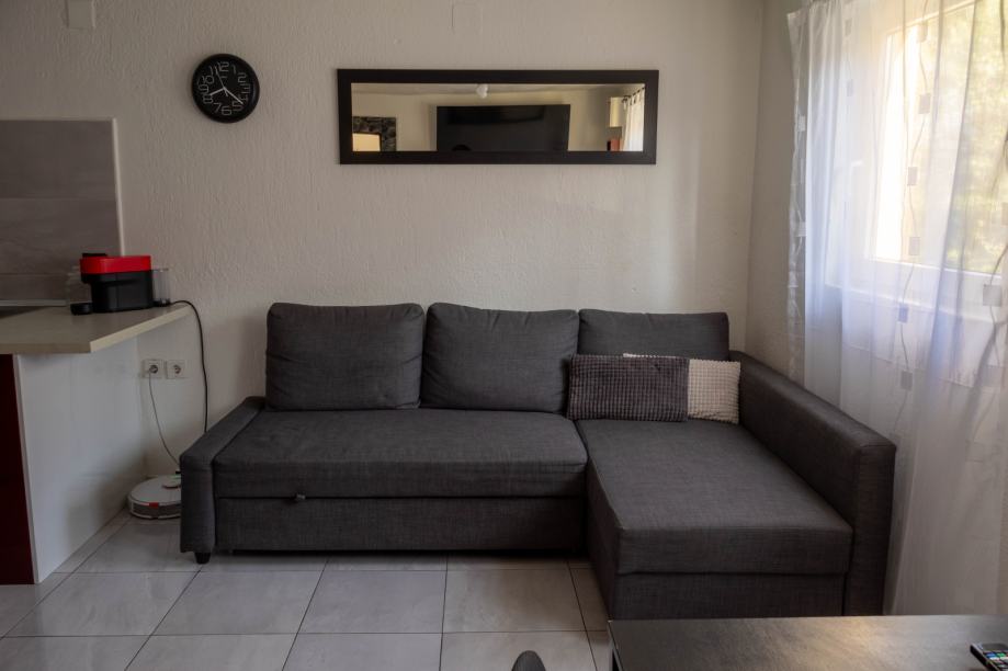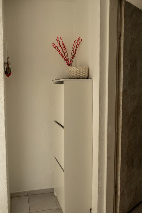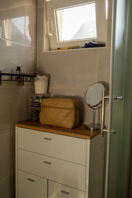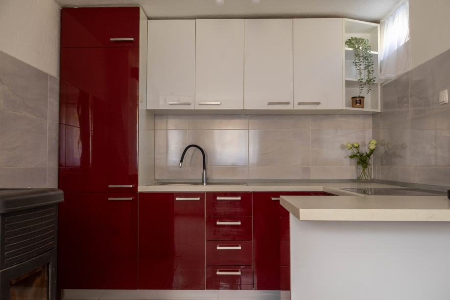 Kuća se prostire na tri etaže – podrum, prizemlje i kat – i ukupne je površine 112 m², odnosno ima dnevni boravak s kuhinjom, dva hodnika, kupaonicu i tri spavaće sobe. Kuća je u potpunosti namještena.