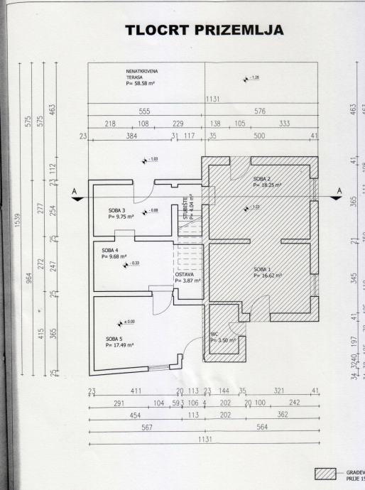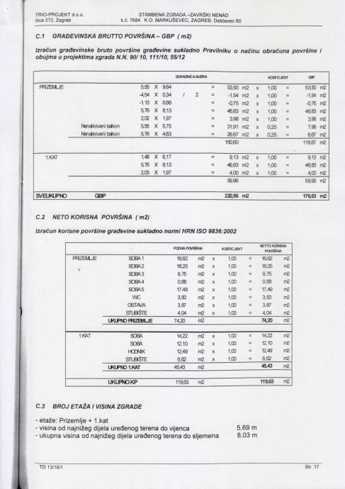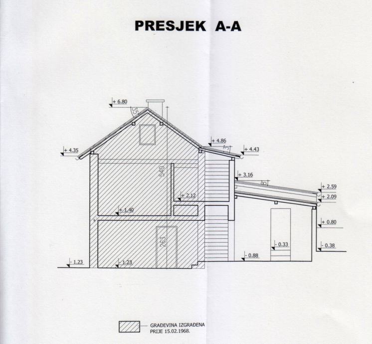 Stara kuća za totalnu rekonstrukciju ili rušenje (građena prije 1968. g.) nadograđena je novijim manjim objektom u roh-bau stanju (legalizirano). Ukupna postojeća građevinska bruto razvijena površina objekata iznosi 263 m2, te postoji mogućnost dogradnje cca 43,5 m2.