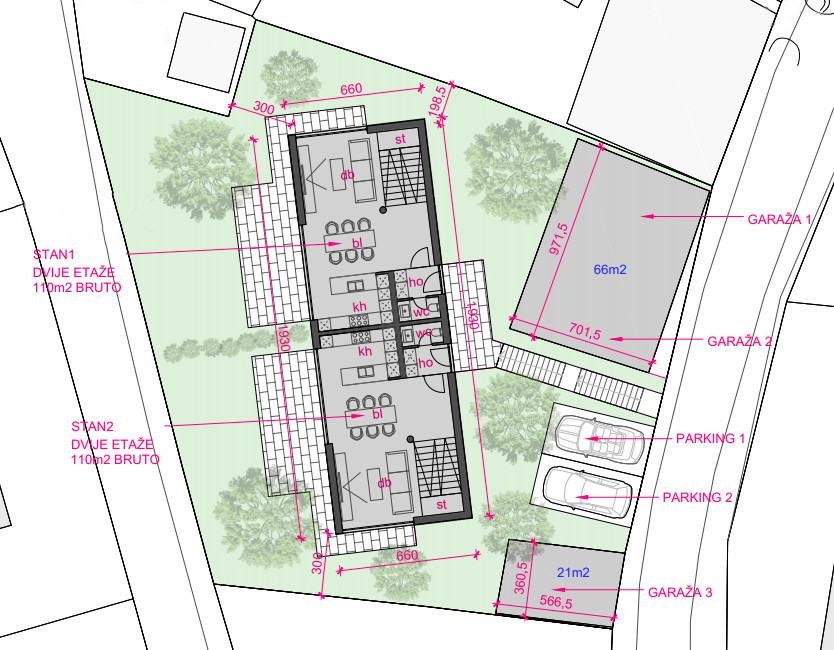 Ispod kuća nalaze se dvije garaže (legalizirane) površine 59,43 m2 i 15,76 m2