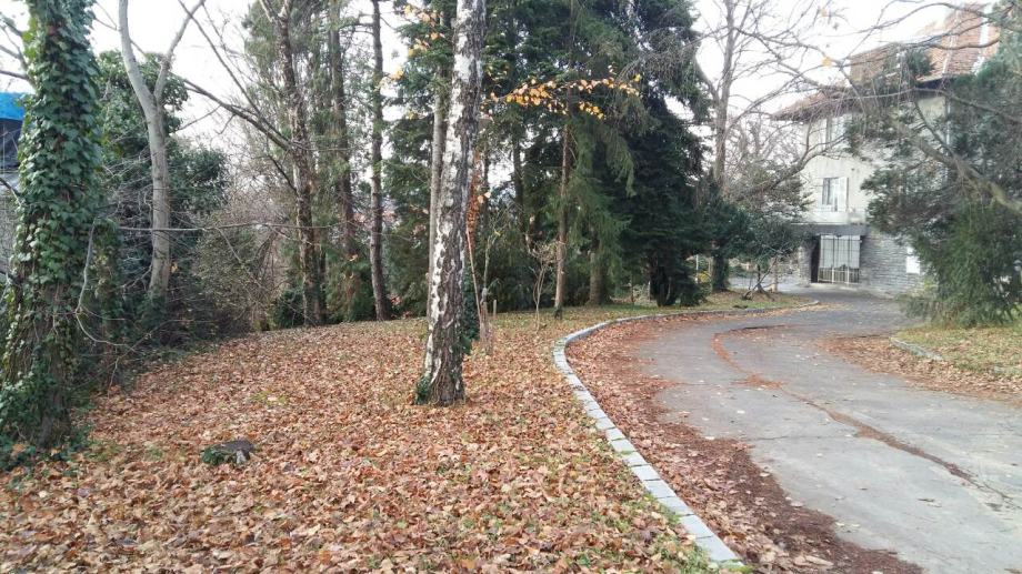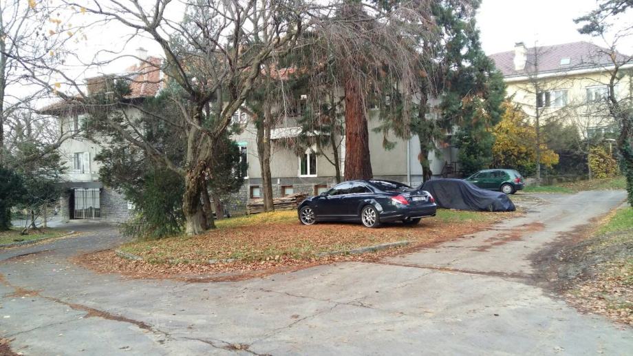 Prodaje se prednji dio vile koji gleda prema Nazorovoj. U naravi dio kuće koji se sastoji od suterena, prizemlja, kata i potkrovlja i ima 2 zasebna ulaza veličine 300 m2 i sastoji se od 3 stana, 13 soba, 3 kuhinje, blagovaone, izbe, 4 kupaonice, 4 wc-a, dva predsoblja, hodnika, degažmana ,drvarnice i balkona kao i dijela zajedničkog zemljišta (1500 m2) Parking je u garaži veličine 70 m2., te još 10 ak parkirnih mjesta na parceli.