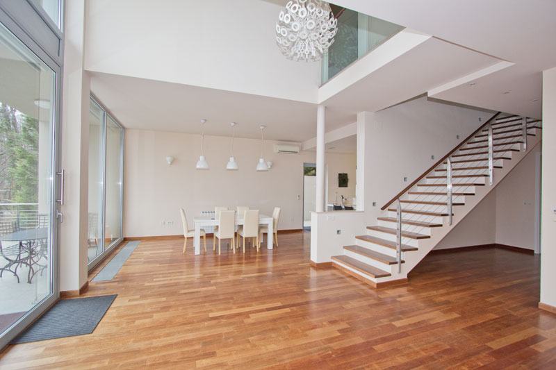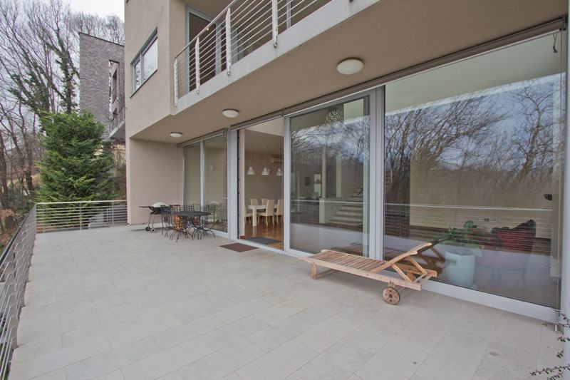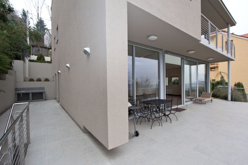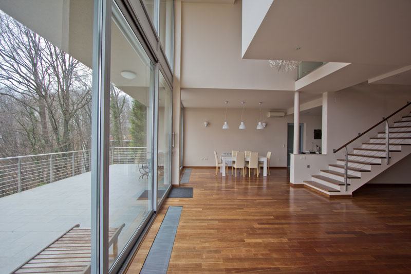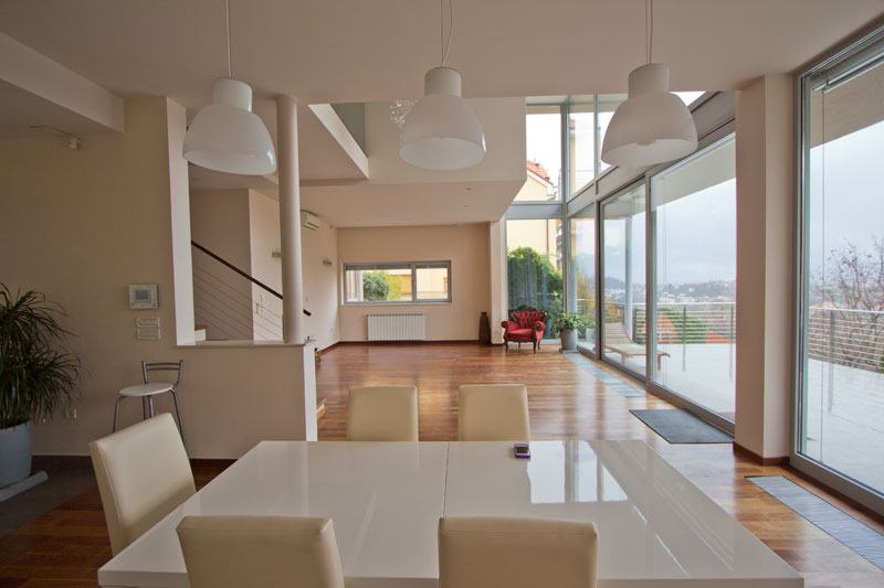 Prelijepa, moderna kuća u Šestinama sa unutarnjim bazenom i saunom, razvedena je na 3 etaže, na gornjim katovima su 6 soba i 3 kupaone, te garaža s direktnim ulazom u kuću. Na donjoj etaži je prostran boravak s velikom staklenom stijenom okrenutoj prema zelenilu i šumi, kuhinja s blagovaonom, izlaz na terasu i vrt te zatvoreni bazen.