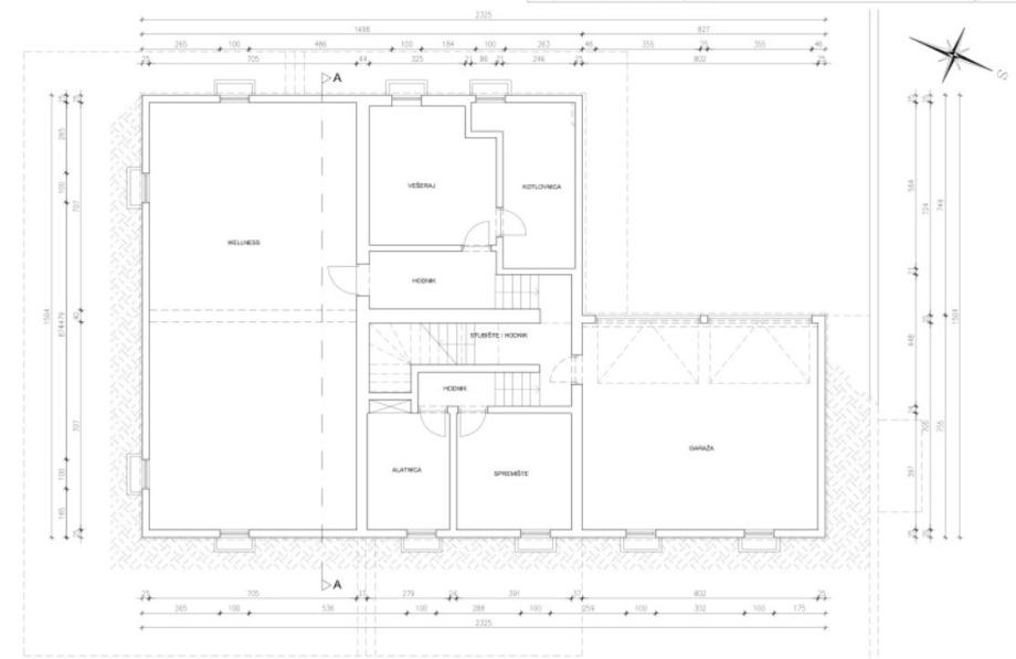 Villa se prostire na tri etaže. Najniža etaža sastoji se od spa područja, dvije ostave, kotlovnice, vešeraja i dvije garaže.