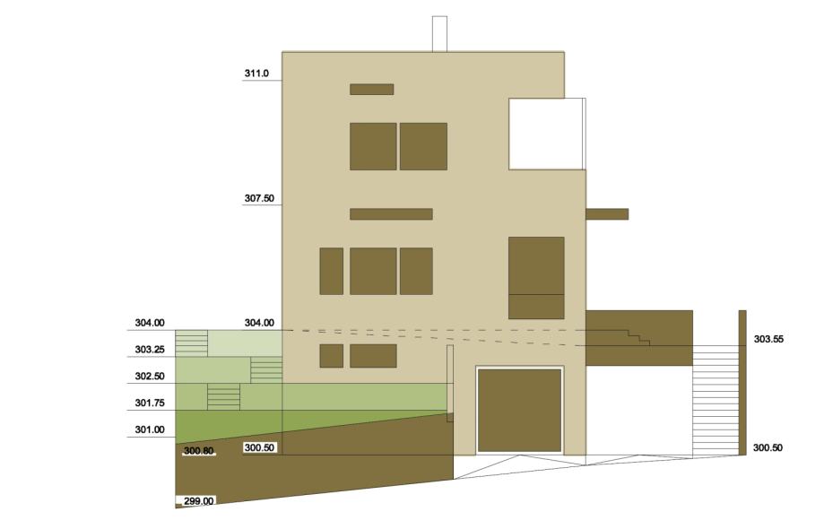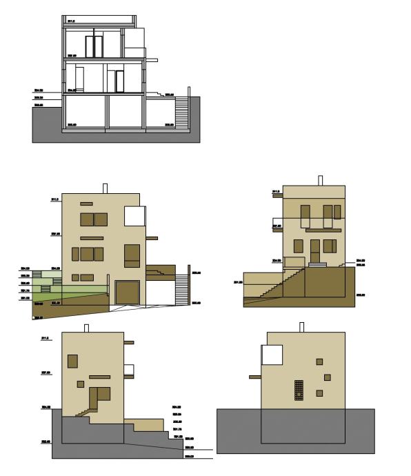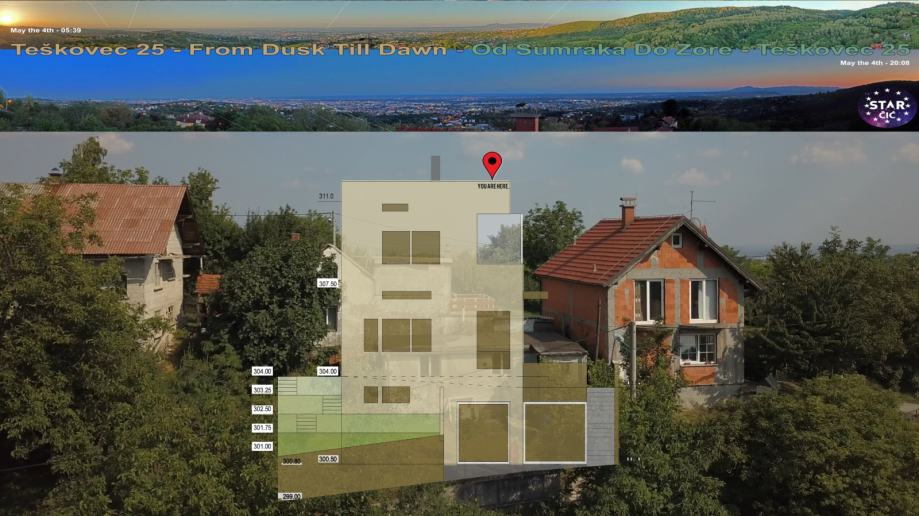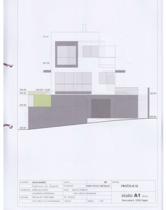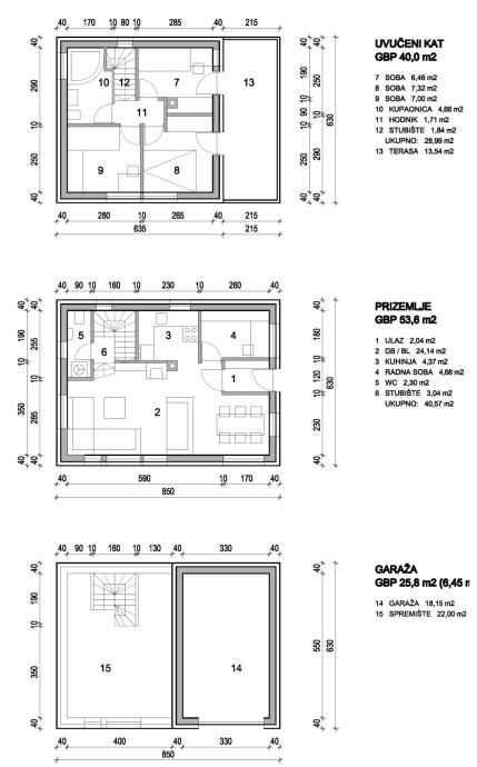 Projekt je napravljen da maksimalno iskoristi prostor i zakonske pogodnosti, tako da su korišteni koeficijenti 0.75 i 0.25. Korištena je pogodnost sa koeficijentima tipa "uvučeni kat" i ravnog krova na kojem nije ograda nego ukrasna "atika", tako da praktično imate terasu sa panoramskim pogledom. Dakle, po projektu se može bez obzira na malu kvadraturu zemljišta, ali zahvaljujući postojećem objektu i dobrom projektu u naravi izvuči 200m2 stambenog + garaža za 2 auta, 5 x 2.5m po parkingu.