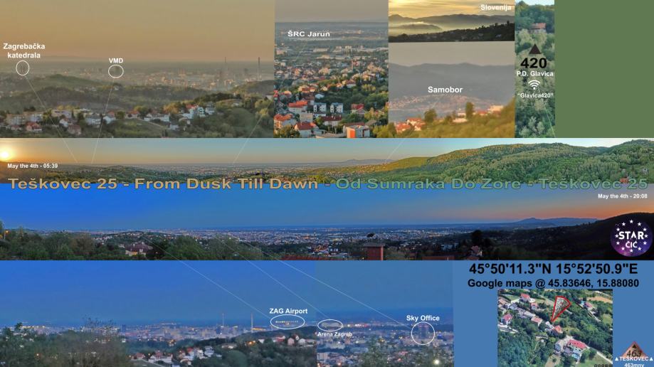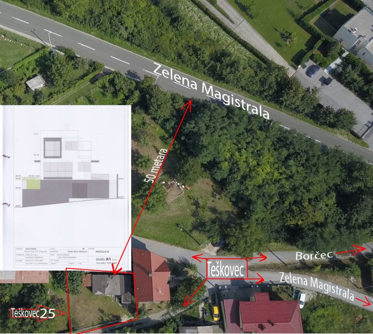 Kuća je na samoj granici parka prirode Medvednica, na adresi Teškovec 25, prva pod tim brojem bez slova u adresi, na početku malog šumskog slijepog odvojka, a svega točno 50 metara iznad Zelene Magistrale. Sa tog križanja ima spoj odma na Zelenu Magistralu ili na Borčec tunelom uz potporni zid susjeda Mirka Filipovića ispod magistrale. Tu je busna stanica Borčec, a autom ste za 10 minuta na Jankomiru ili u Vrapcu. Brzo ste na Ilici u gradu a i brzo pobjegnete na obilaznicu van grada. Dakle u miru i tišini, cvrkutu ptica, bez smoga, sa pogledom 100% na prirodu na jednoj strani a grad na drugoj, a opet povezani. Kuća je na idealnih 300 mnv, ne prerijetkog zraka, a opet uvijek iznad magle, koju ponekad možete vidjeti kao jezero ispod kojeg svijetli grad, dok ste vi iznad tog čepa smoga.