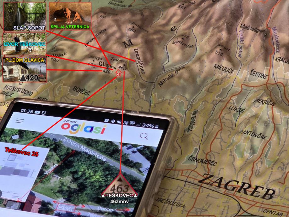 Pogled na istok je sve do Katedrale, na jug na Samoborsko gorje a na zapad na pl.dom Glavica koji je zračne linije udaljen 750 metara, između nema kuća. Na pola toga puta, ispod kuće u šumi je izvor, i to pravi arteški bunar koji nikada ne presuši a za kojeg malo tko osim domaćih zna, jer nije na planinarskoj stazi koja ide preko špilje Veternice nego putu koji je nastavak ovog slijepog odvojka ulice Teškovec. Ispred izvora je i betonski bazen u kojem su se prije ljudi kupali ljeti. Špilja Veternica je dakle par minuta dalje od tog izvora koji je najbliži kući, a u nastavku se dođe do pl.doma. U ulici je par kuća za najam, a prva preko puta je bookirana stalno po 200€/dan.